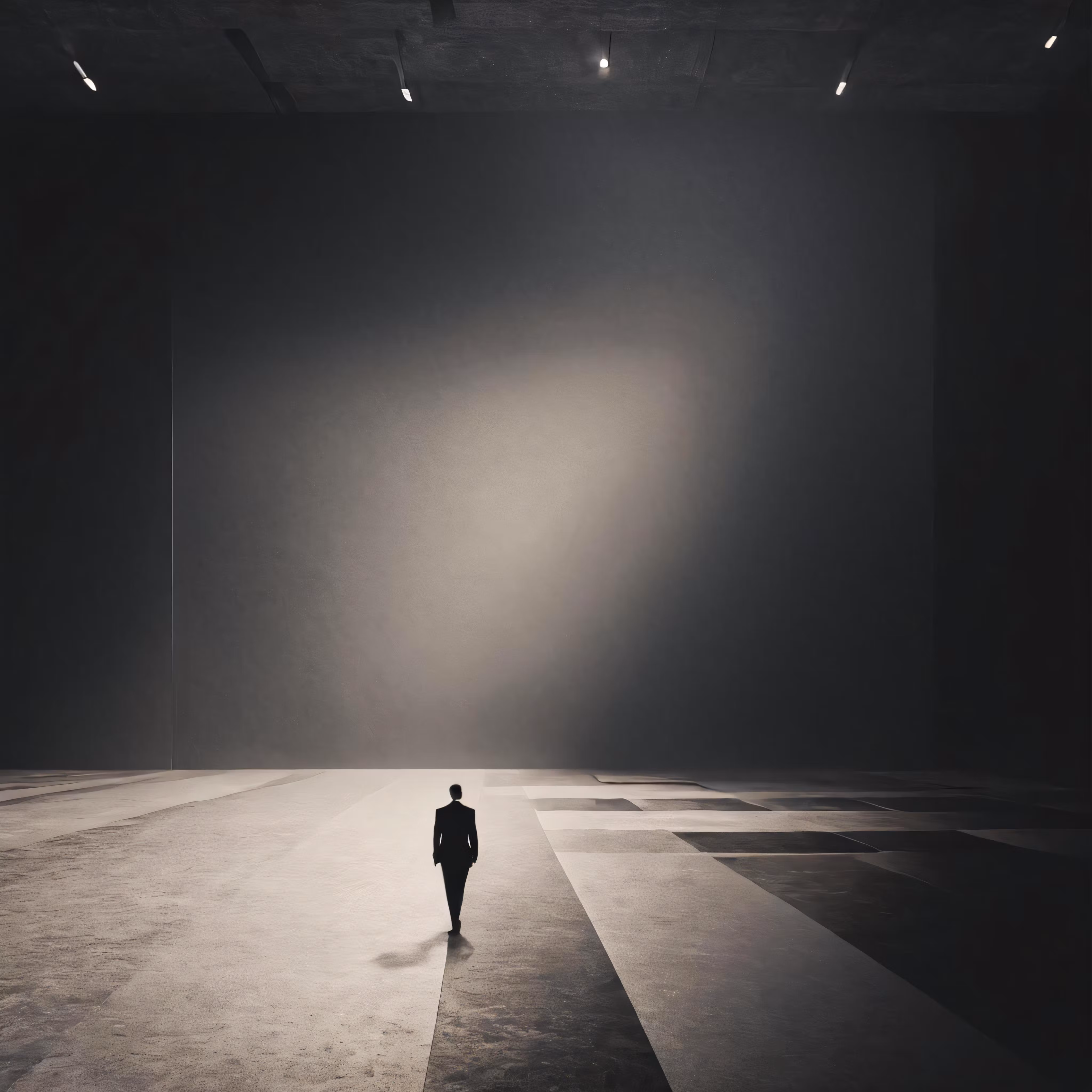 High resolution picture, free to use, an advertisement for a bicycle shop and it says 30 /a man walking through a very large dark room