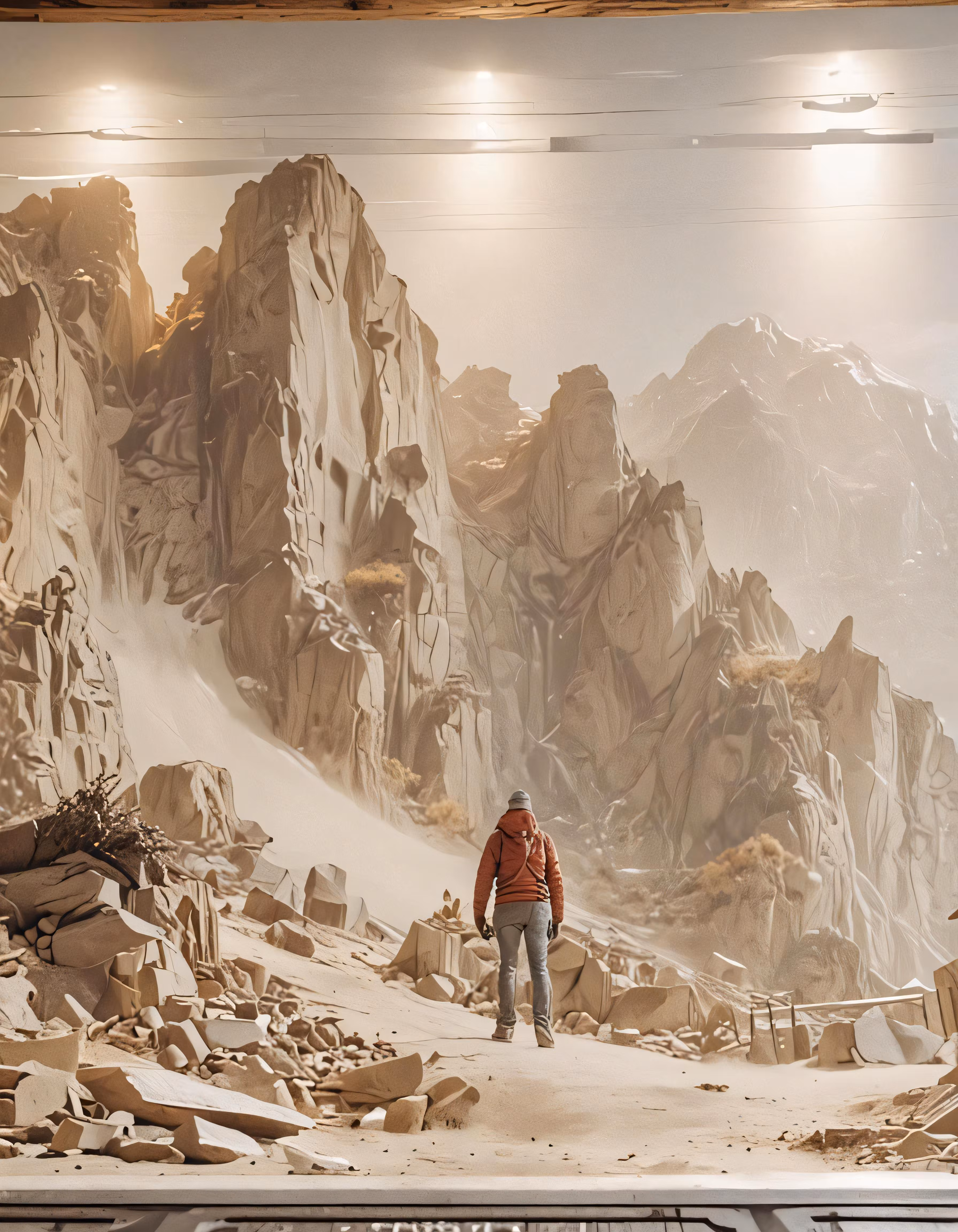 High resolution picture, free to use, an advertisement for a bicycle shop and it says 30 /a man walks down a rocky cliff towards mountains