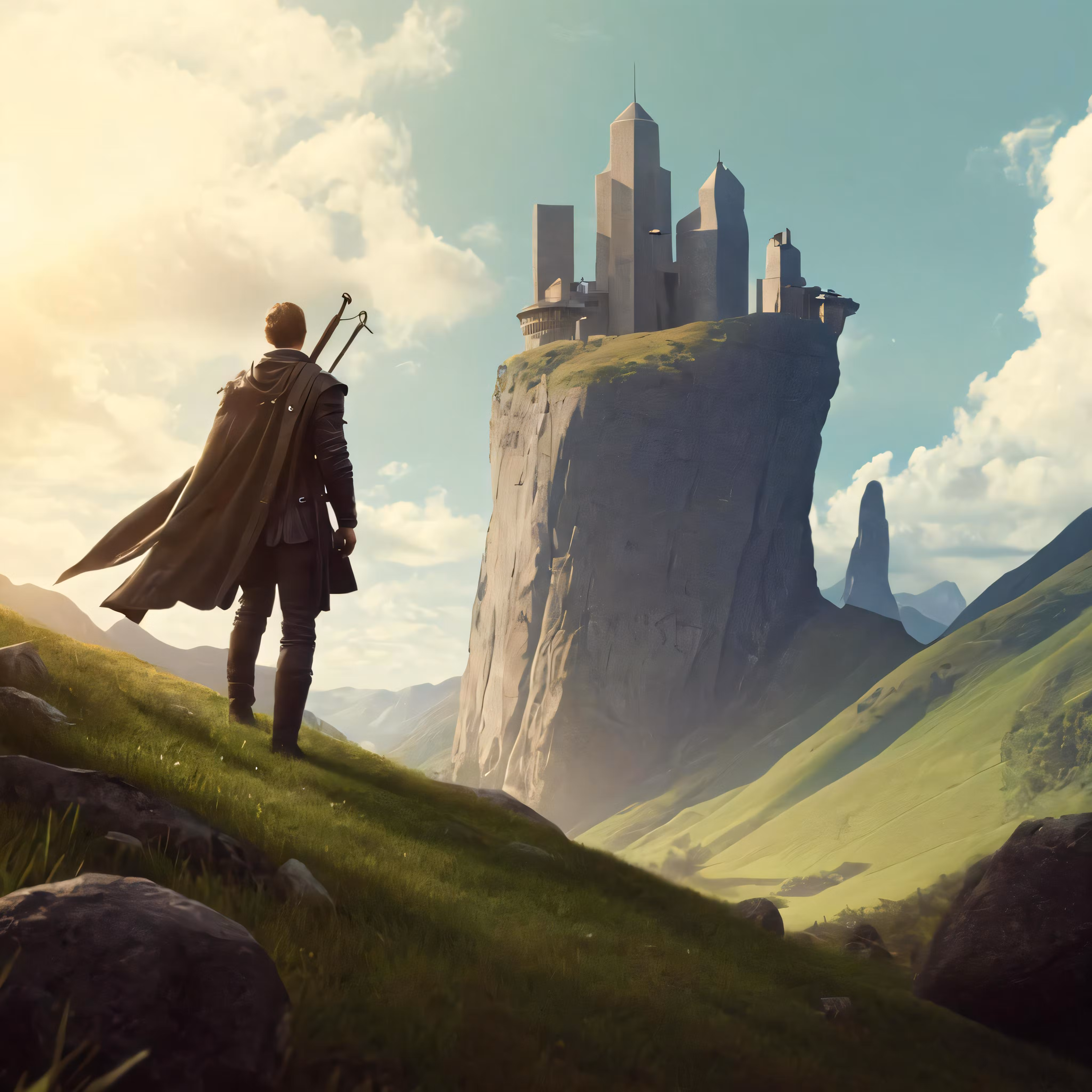 High resolution picture, free to use, an advertisement for a bicycle shop and it says 30 /a man with a sword looks at a castle on a rock formation