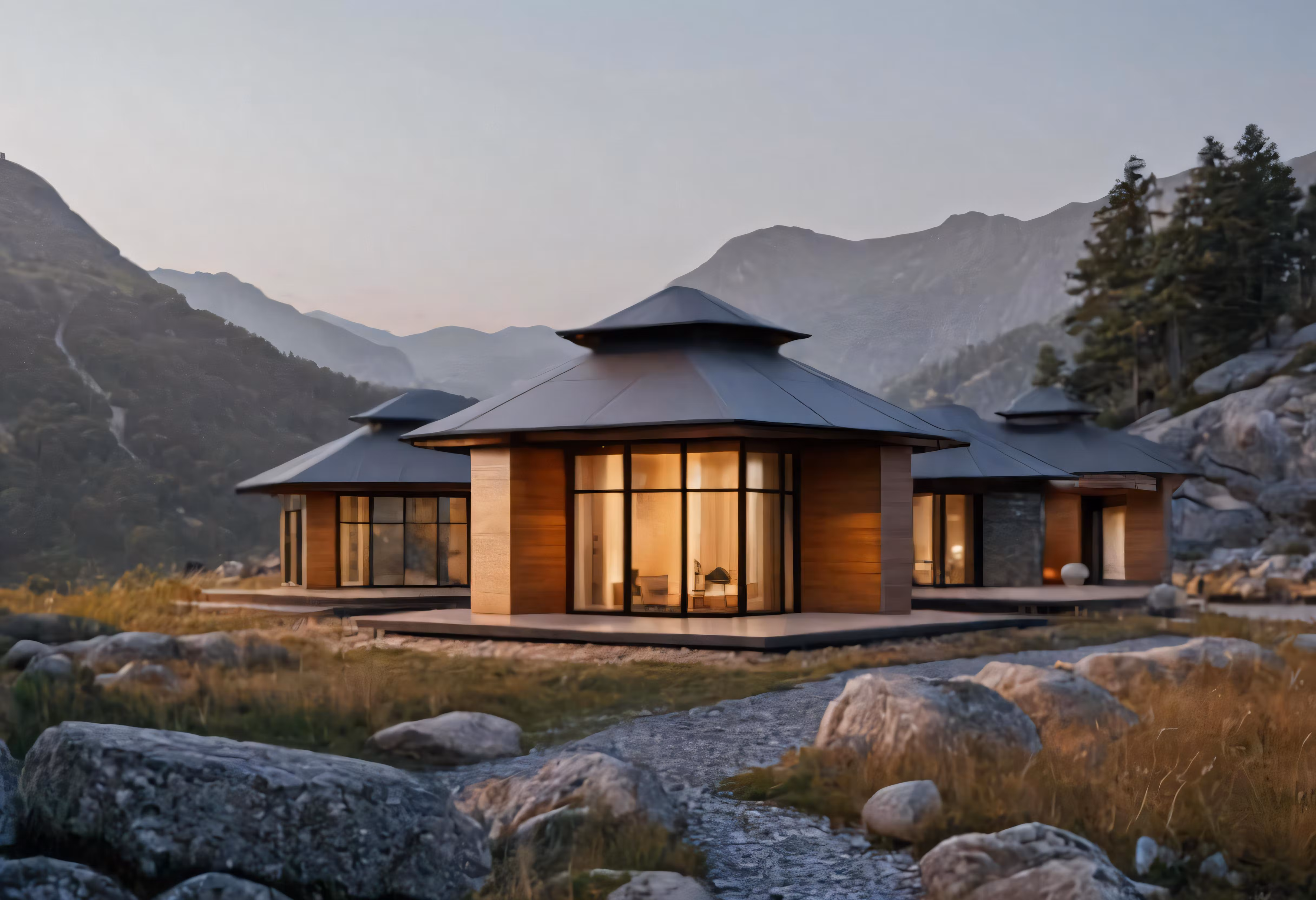 High resolution picture, free to use, an advertisement for a bicycle shop and it says 30 /a modern design round shaped building is illuminated by the sun