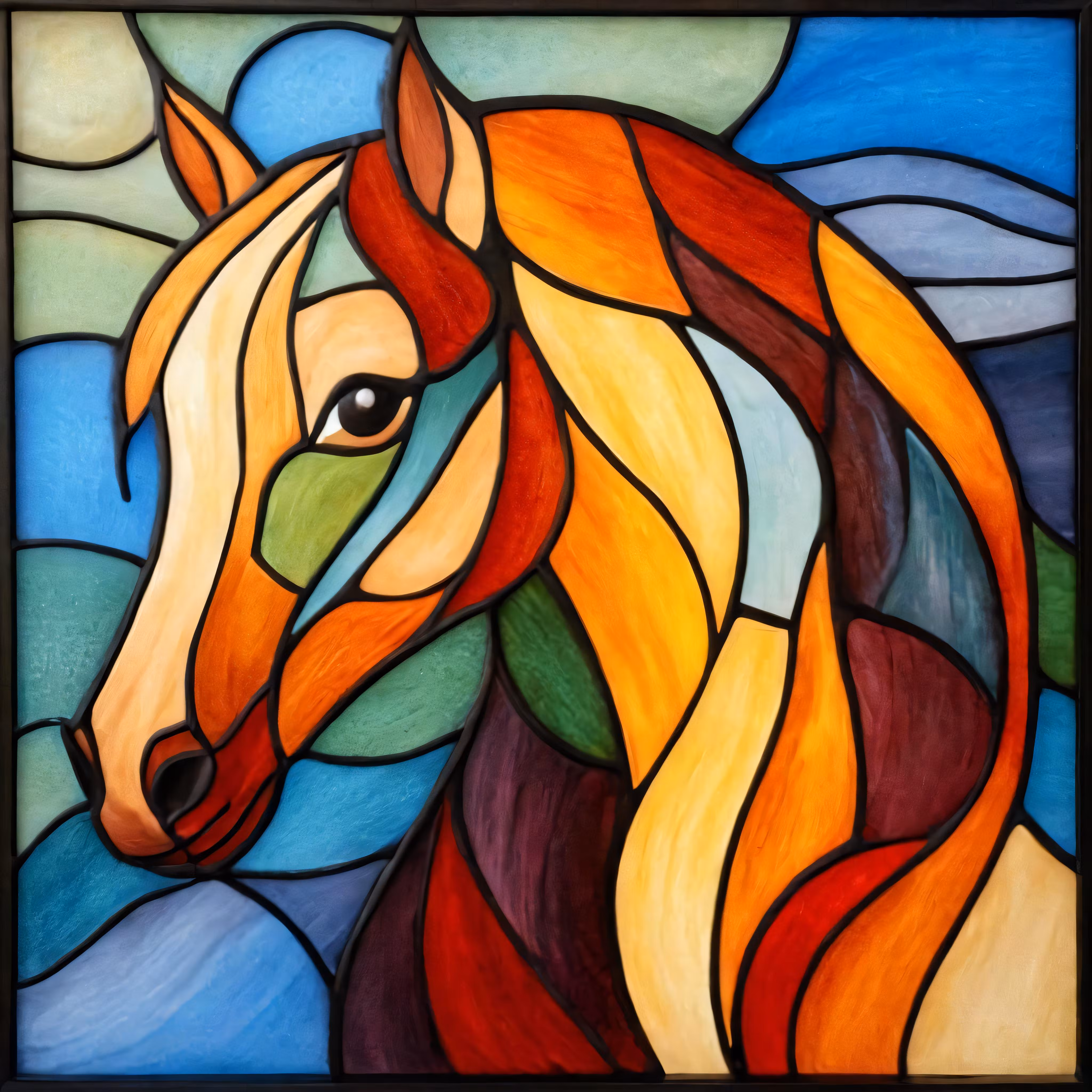 High resolution picture, free to use, an advertisement for a bicycle shop and it says 30 /a painting of a horse made with multicolored stained glass