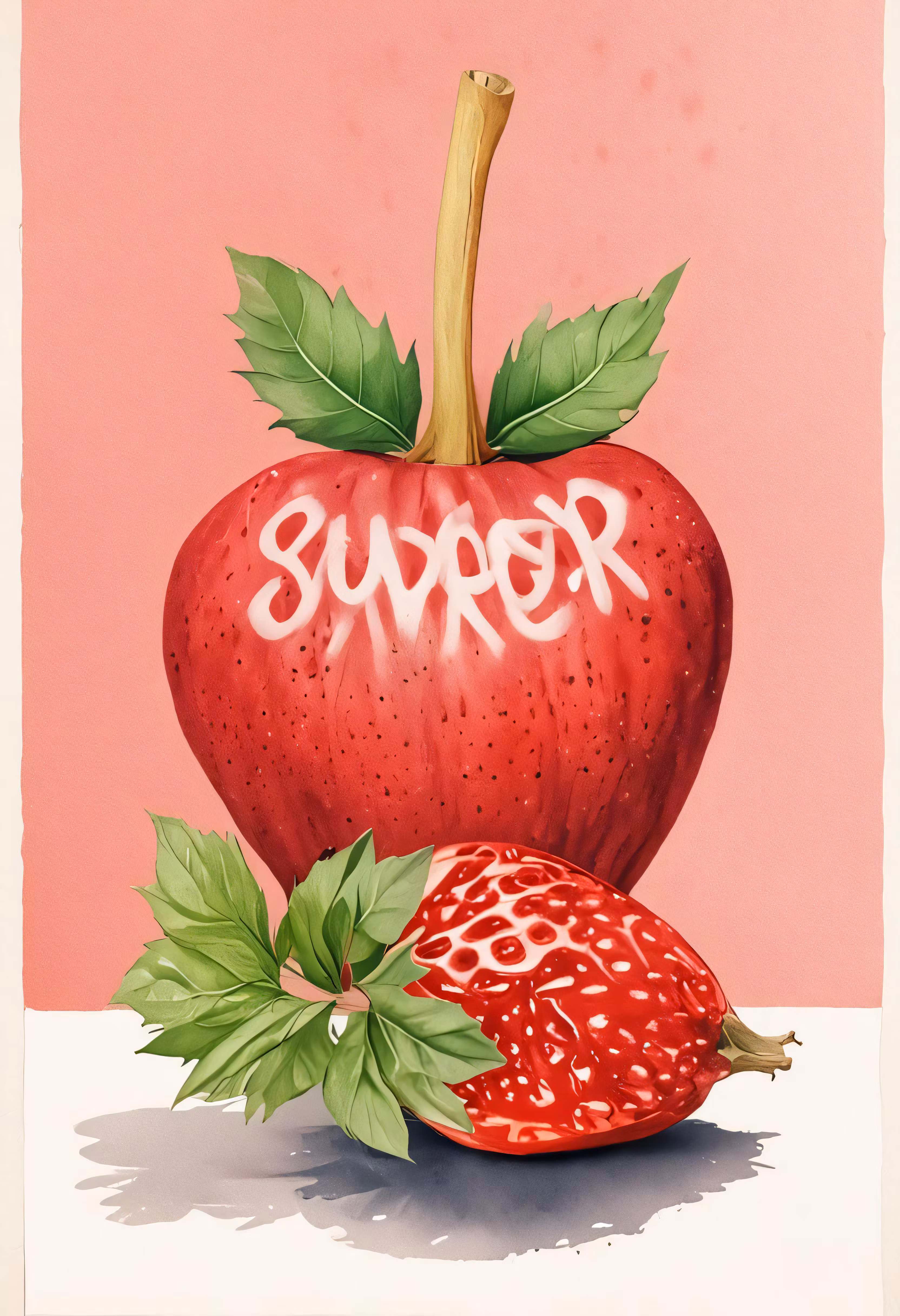 High resolution picture, free to use, an advertisement for a bicycle shop and it says 30 /a painting of an apple and strawberry on top of each other
