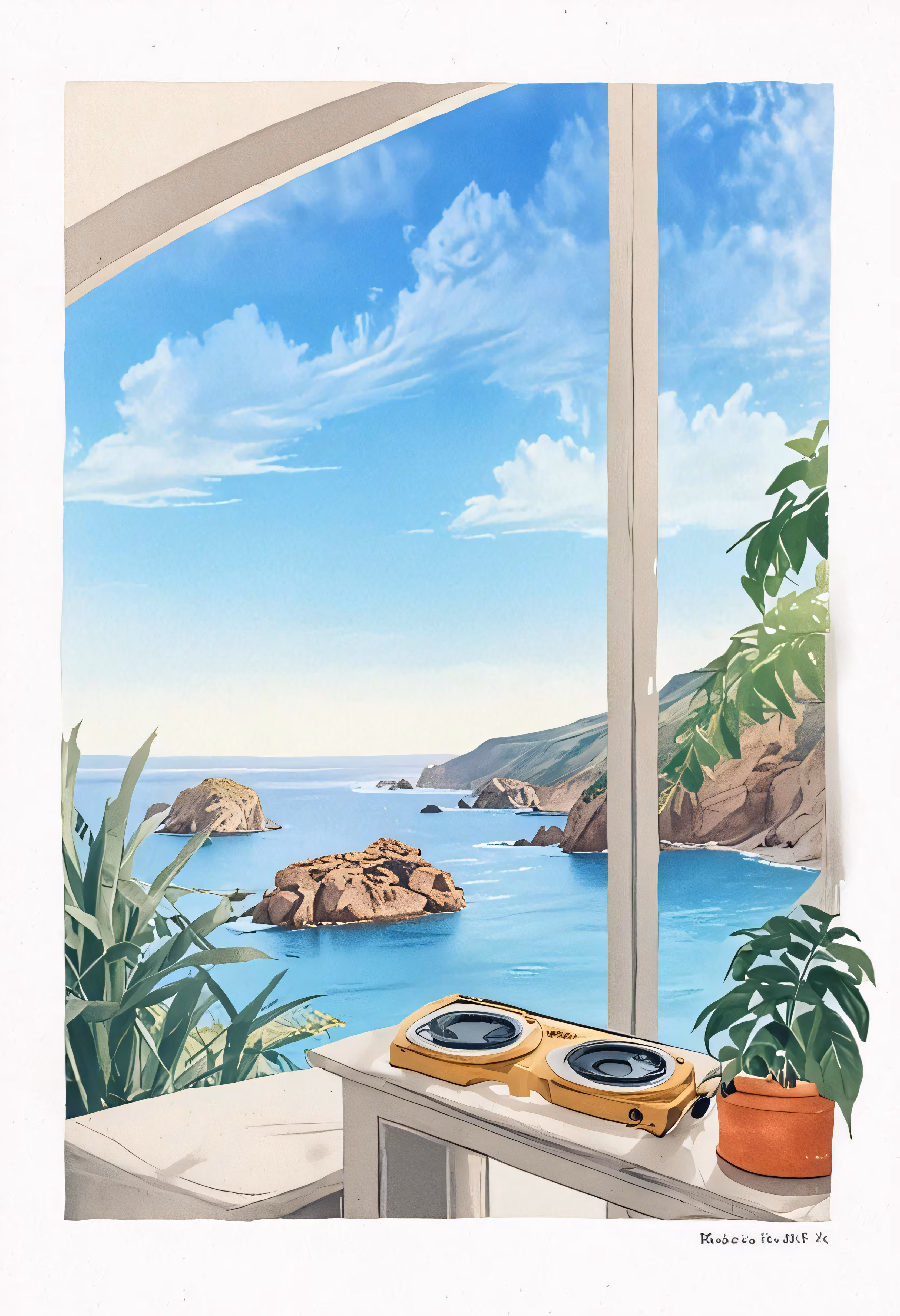 High resolution picture, free to use, an advertisement for a bicycle shop and it says 30 /a painting of the ocean from a window
