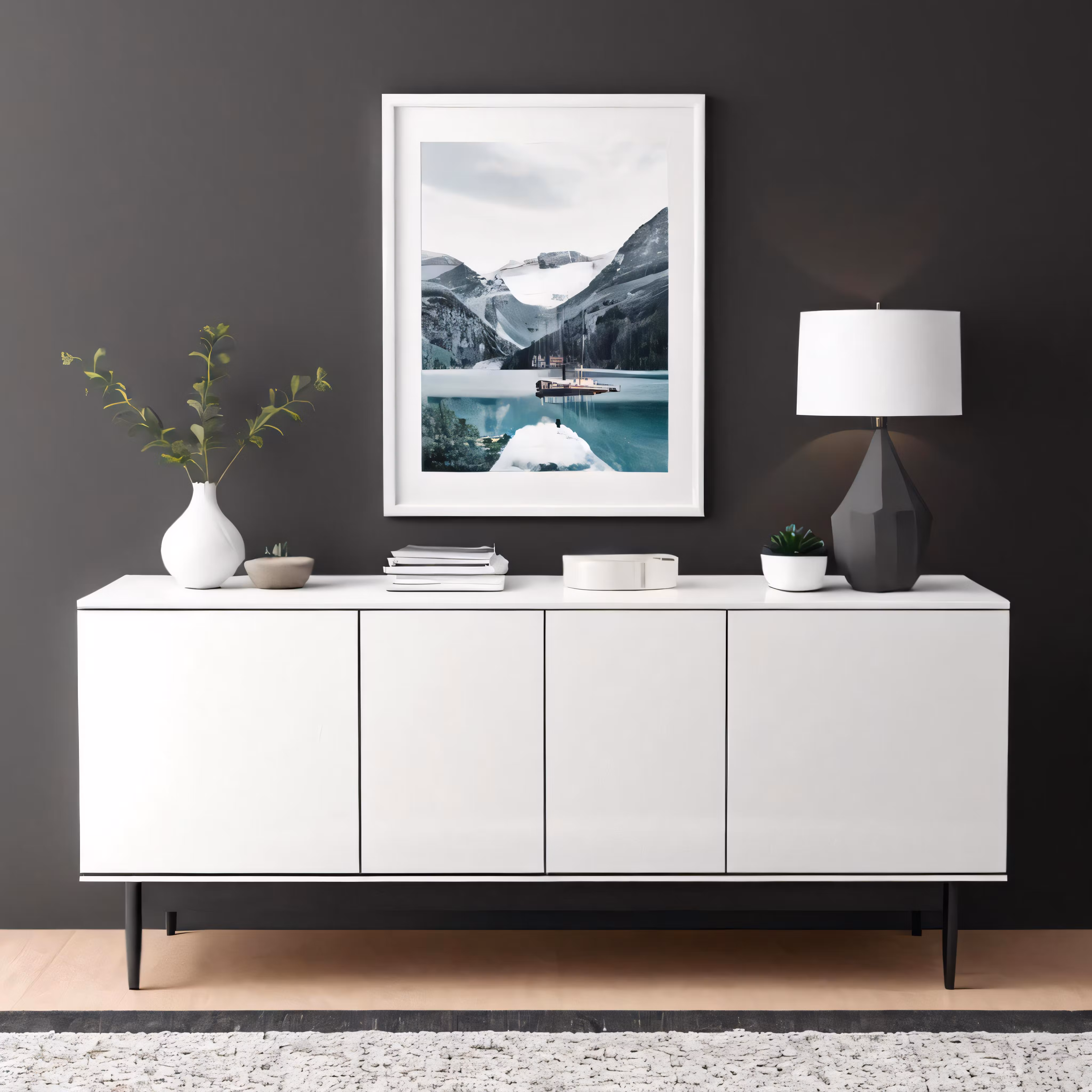 High resolution picture, free to use, an advertisement for a bicycle shop and it says 30 /a picture with water and mountains is hanging above the buffet