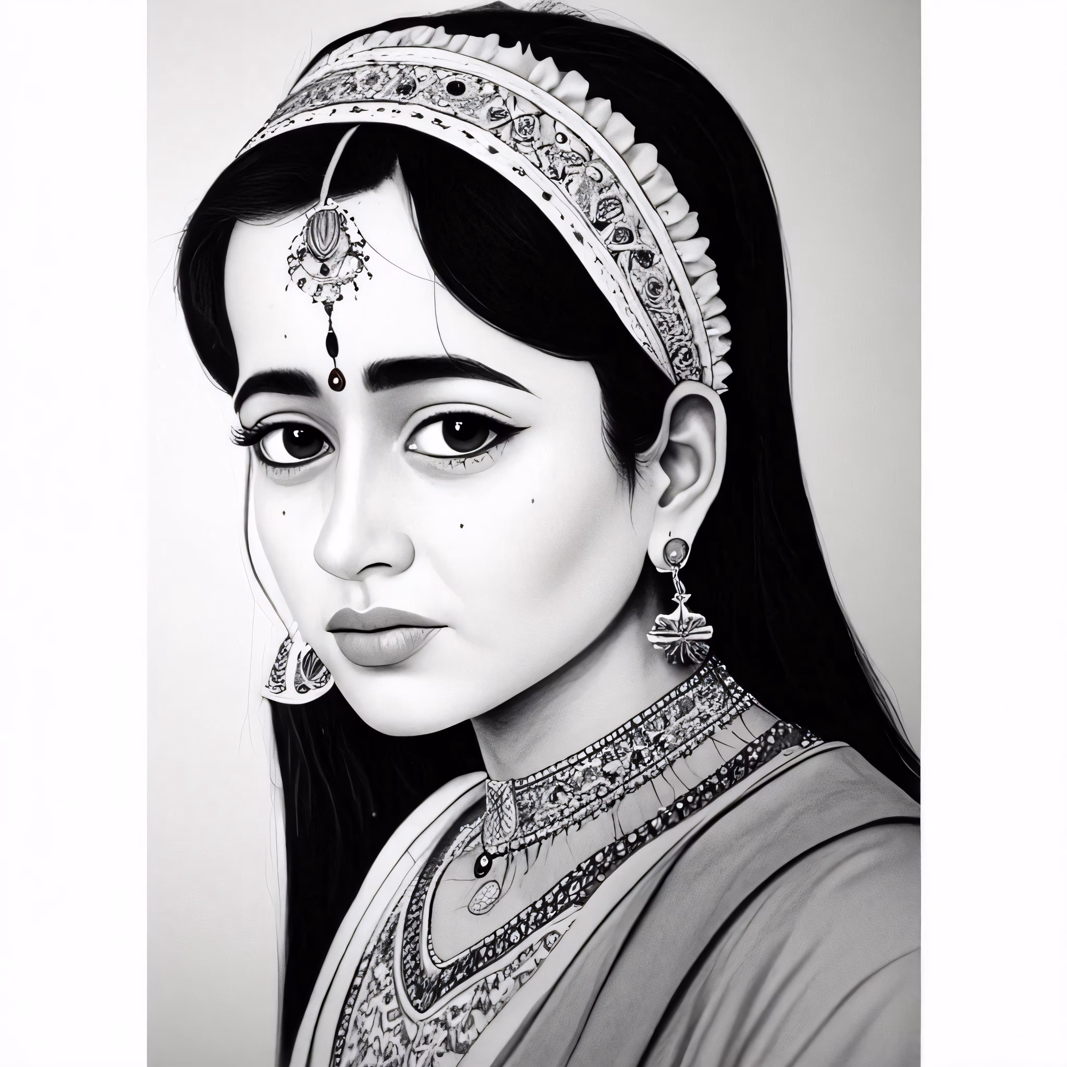 High resolution picture, free to use, an advertisement for a bicycle shop and it says 30 /a portrait drawing of a young indian girl wearing traditional makeup and hair