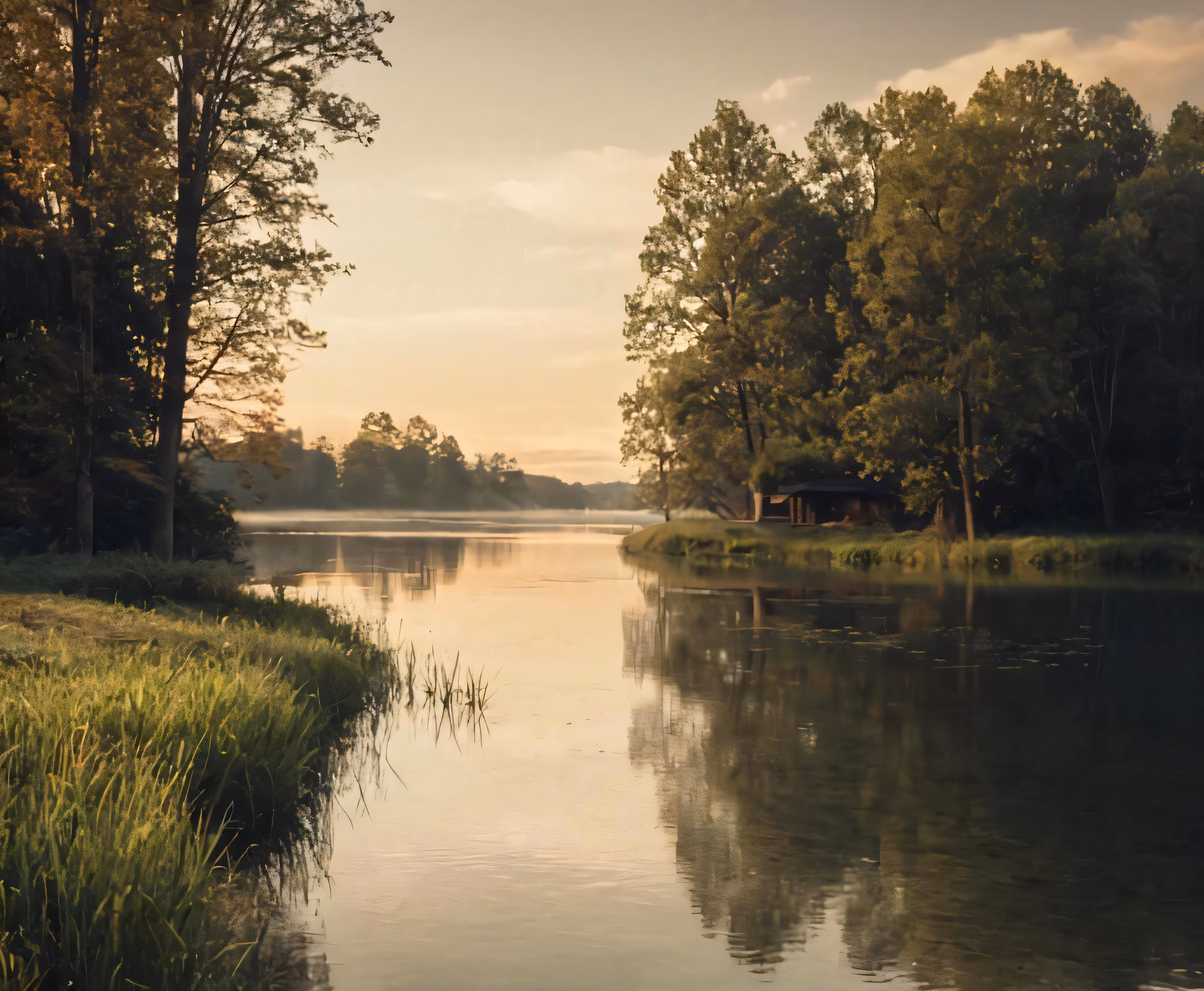 High resolution picture, free to use, an advertisement for a bicycle shop and it says 30 /a river with the sun setting on a tree lined shore