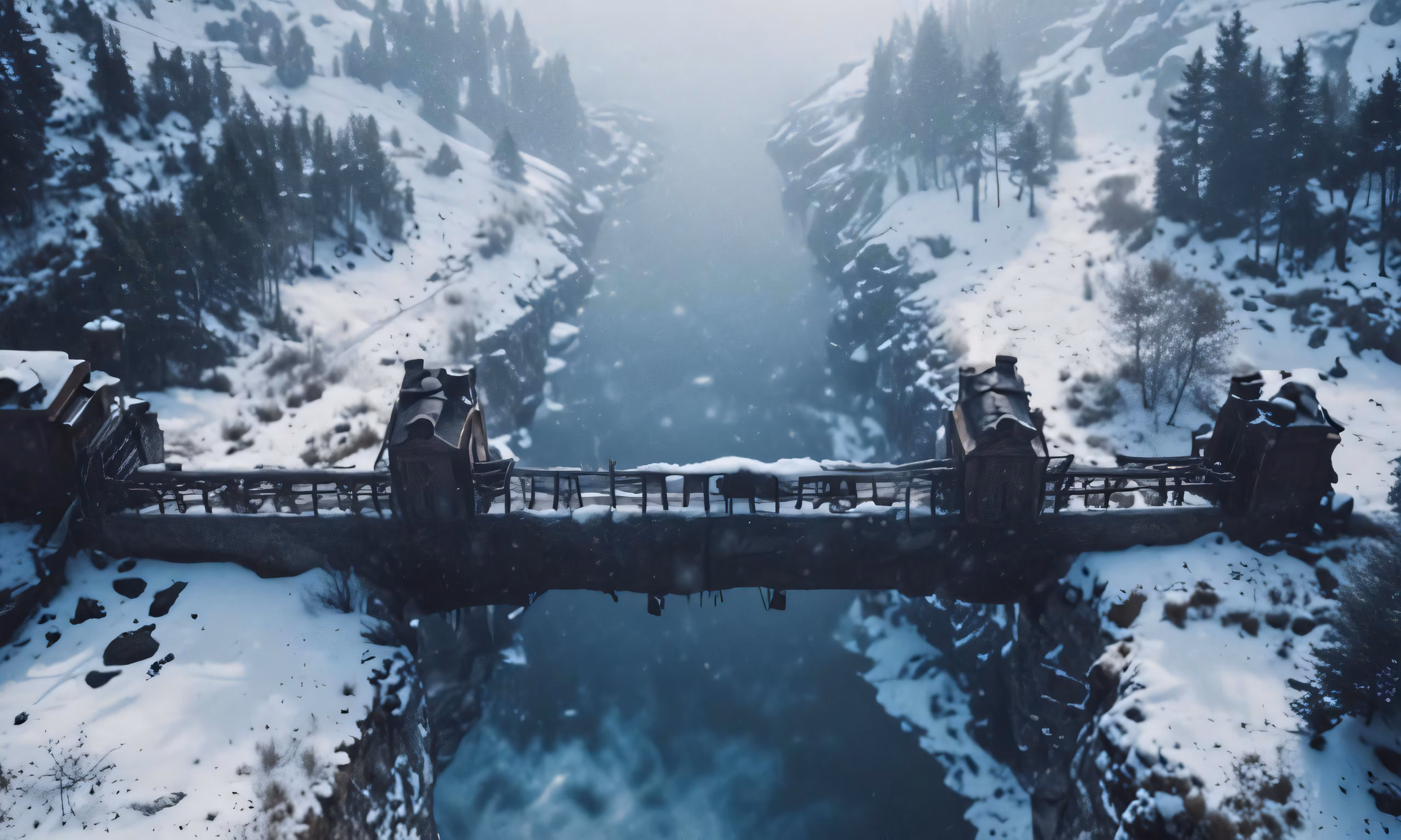 High resolution picture, free to use, an advertisement for a bicycle shop and it says 30 /a snowy landscape that looks like it is going across a bridge