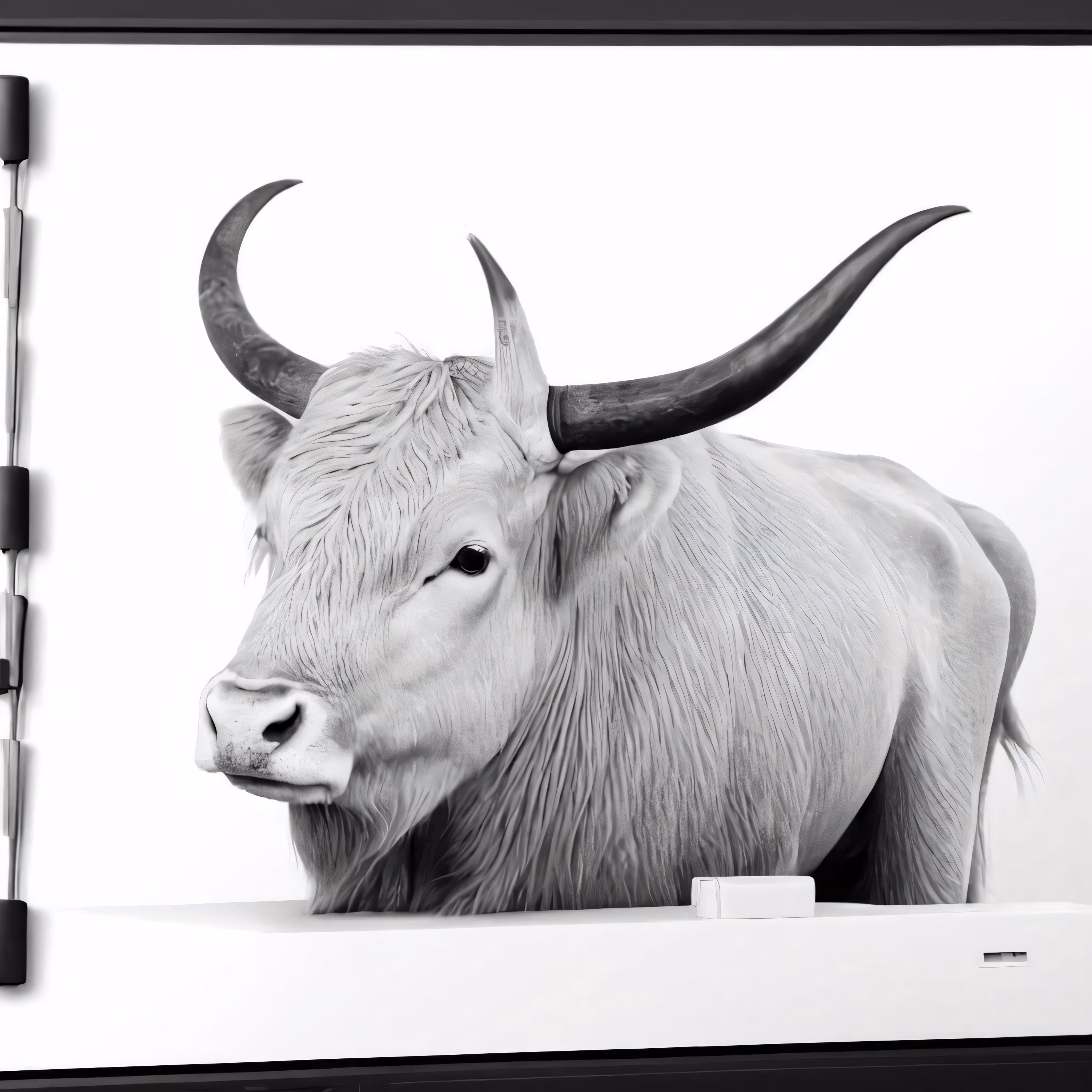High resolution picture, free to use, an advertisement for a bicycle shop and it says 30 /a steer standing on a table with long horns
