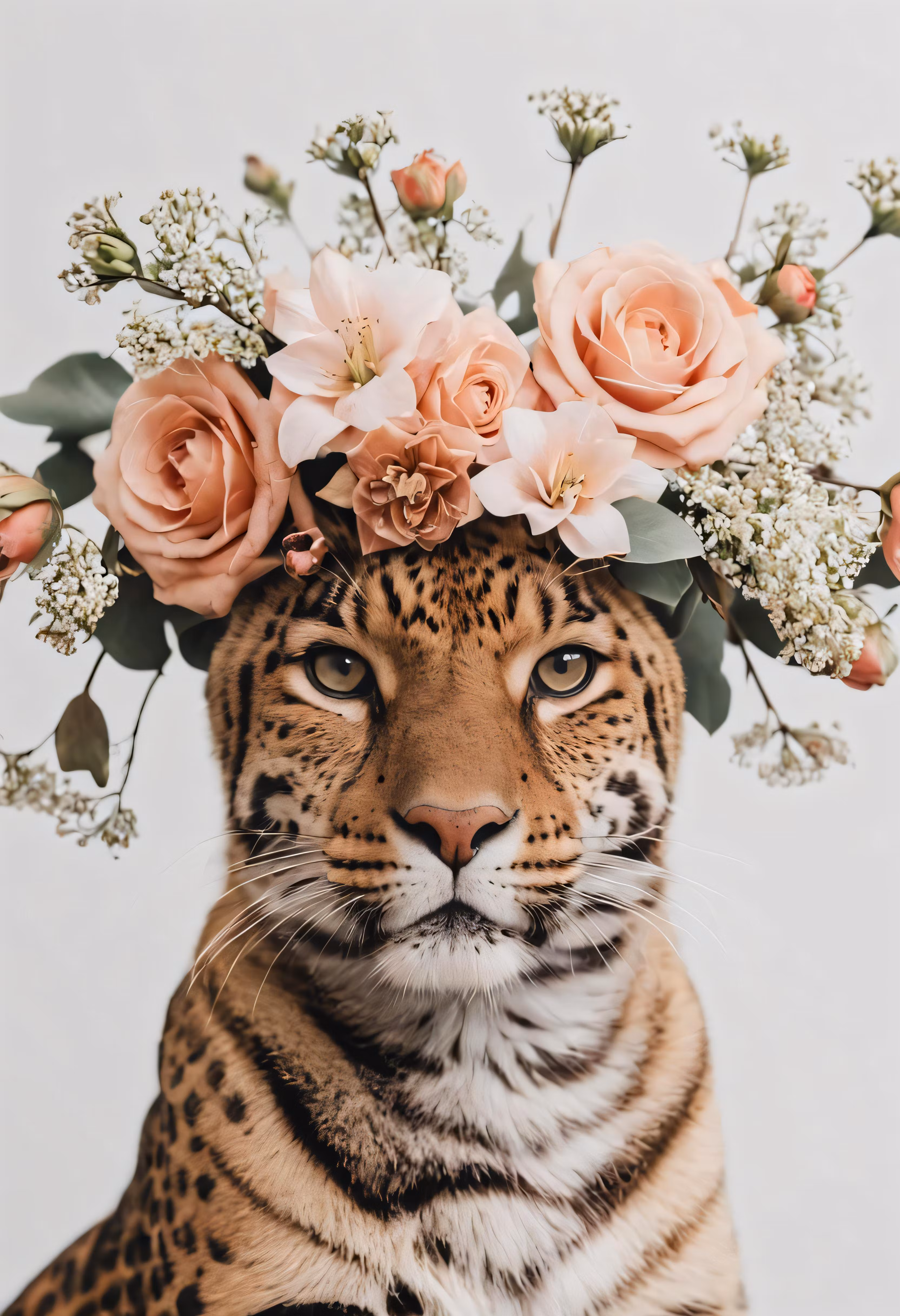 High resolution picture, free to use, an advertisement for a bicycle shop and it says 30 /a tiger with flowers on his head is in the midst of pink flowers