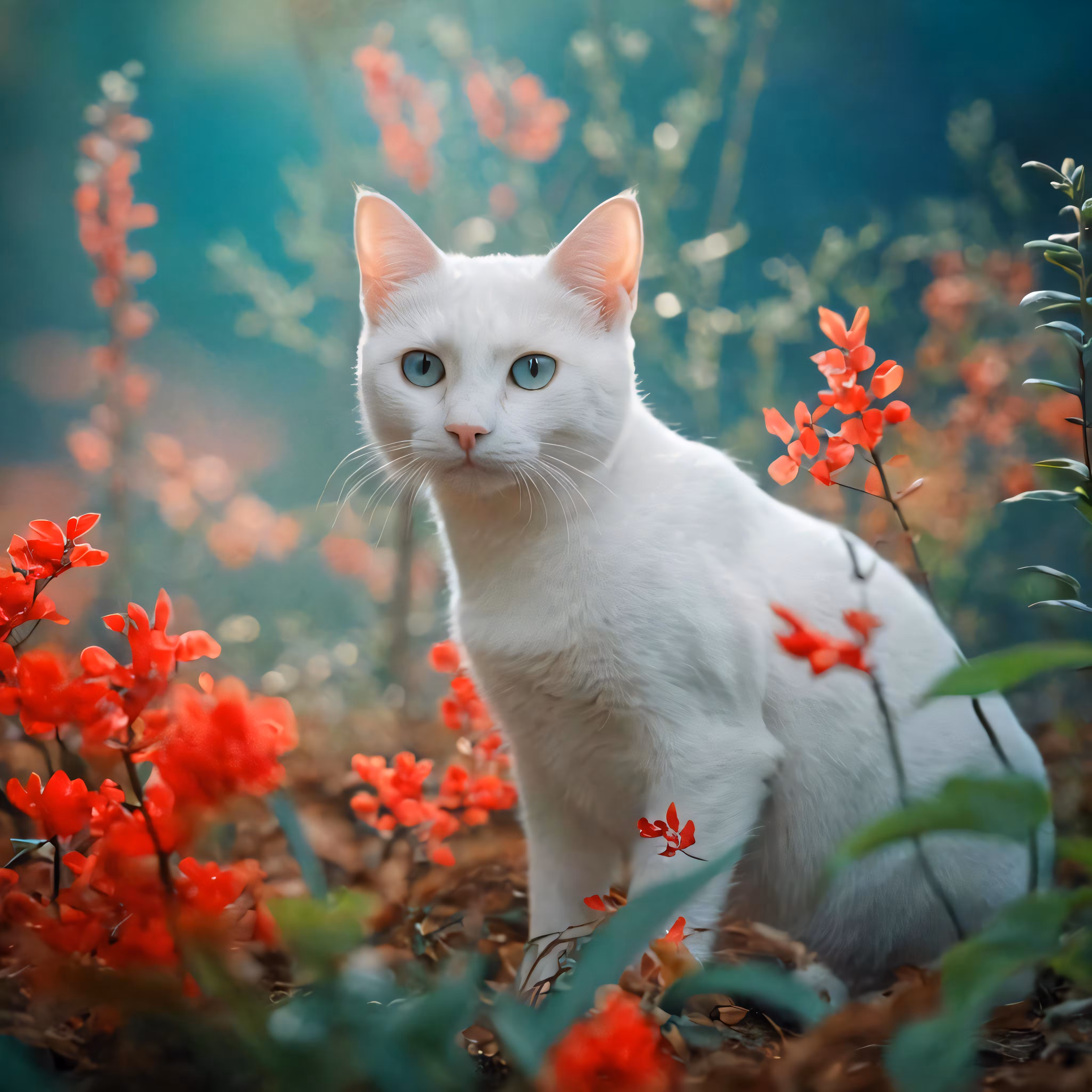 High resolution picture, free to use, an advertisement for a bicycle shop and it says 30 /a white cat sits among red flowers in the forest