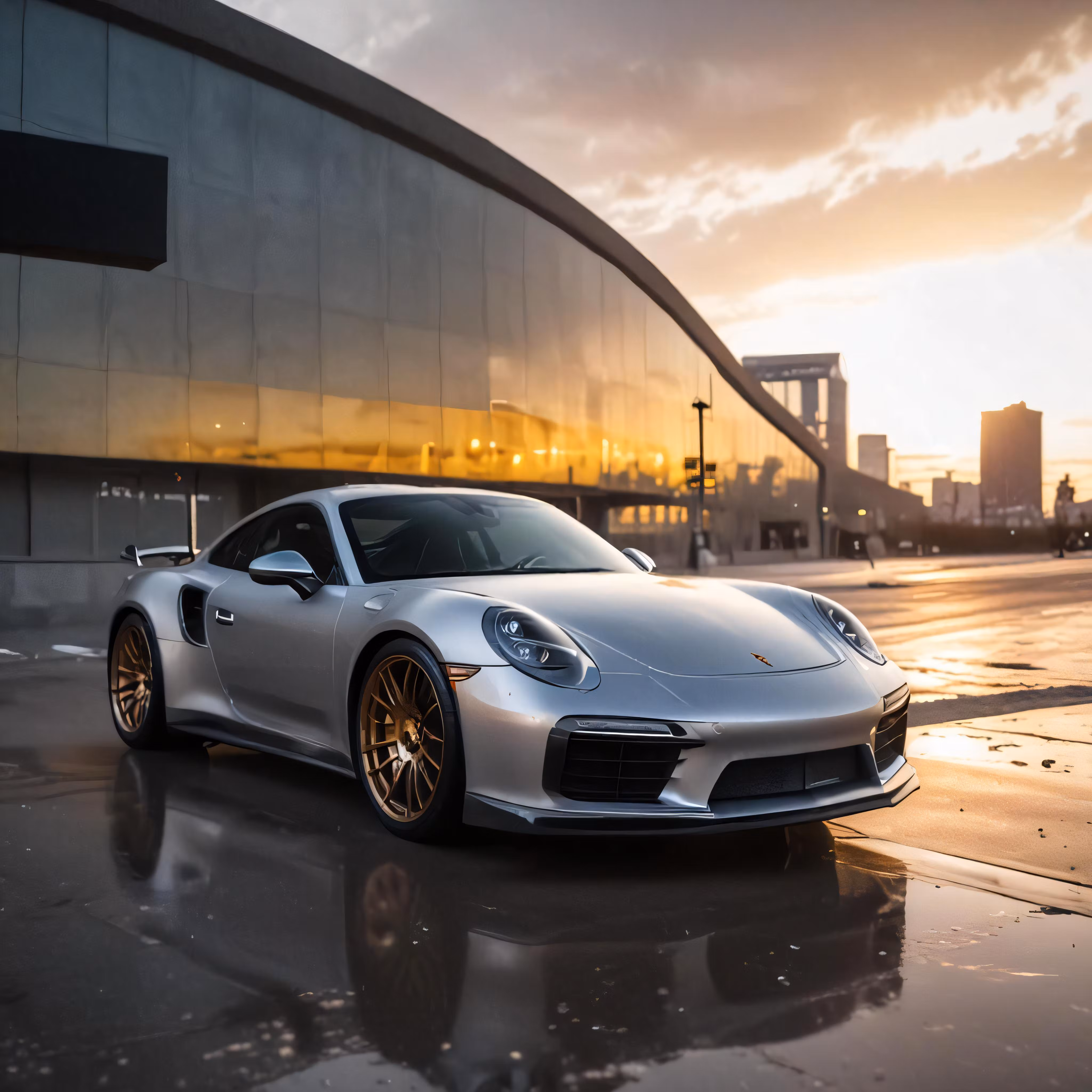 High resolution picture, free to use, an advertisement for a bicycle shop and it says 30 /a white porsche is parked by the water and a building