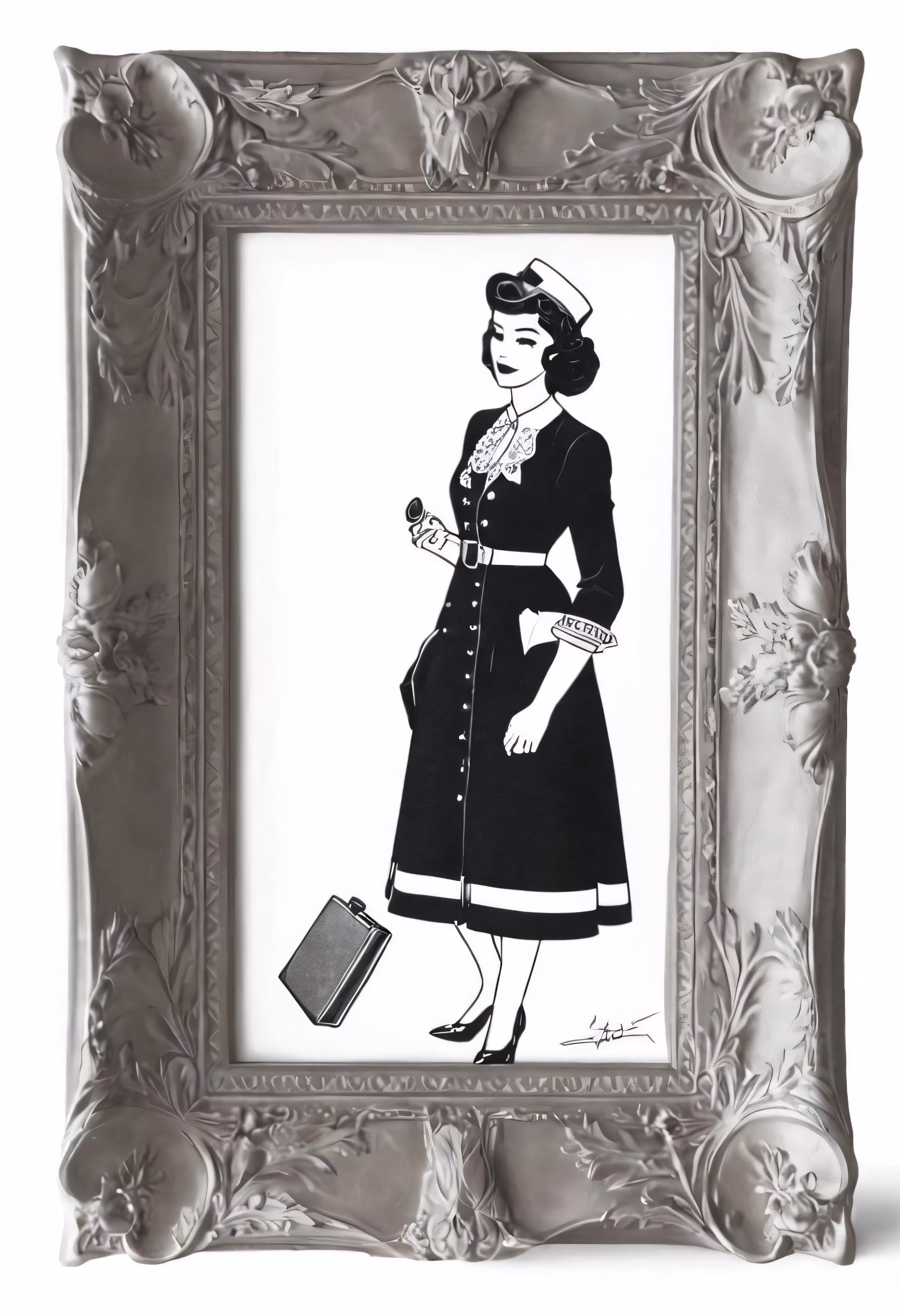 High resolution picture, free to use, an advertisement for a bicycle shop and it says 30 /a woman holding a briefcase and standing in front of a framed image