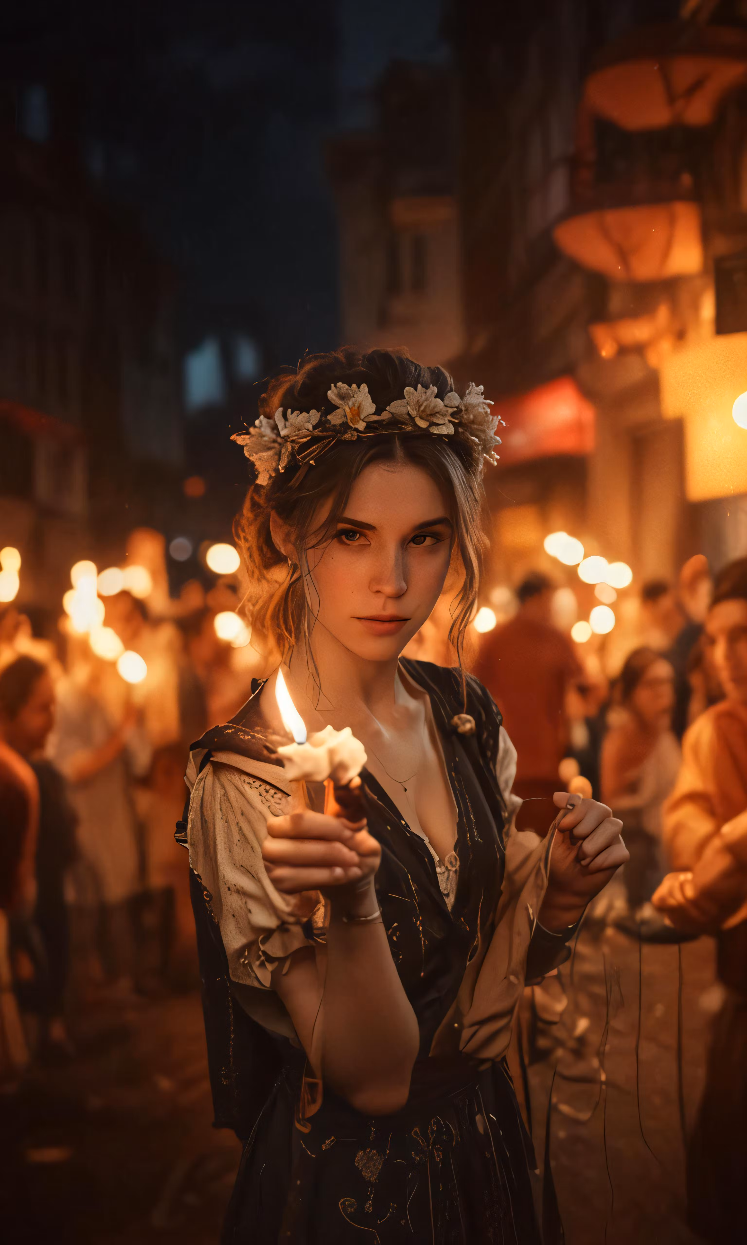 High resolution picture, free to use, an advertisement for a bicycle shop and it says 30 /a woman holding a candle on a crowded street