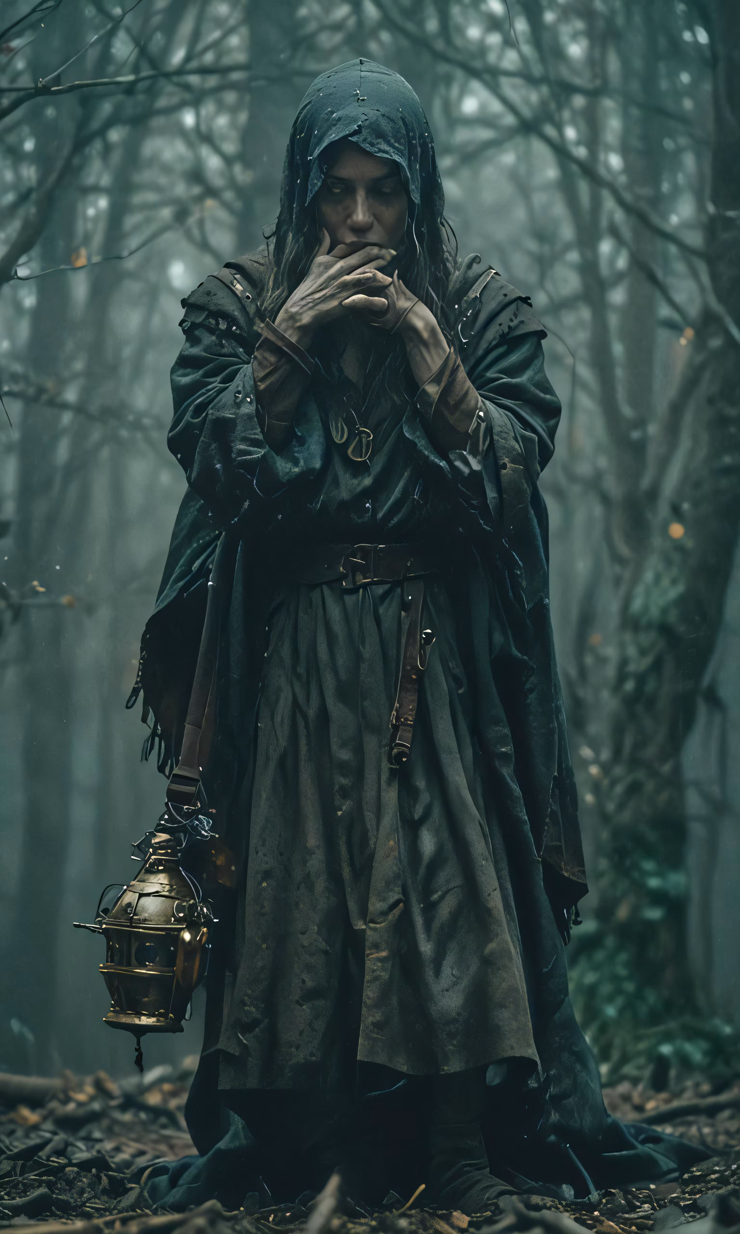 High resolution picture, free to use, an advertisement for a bicycle shop and it says 30 /a woman in a long coat and hood standing in the woods