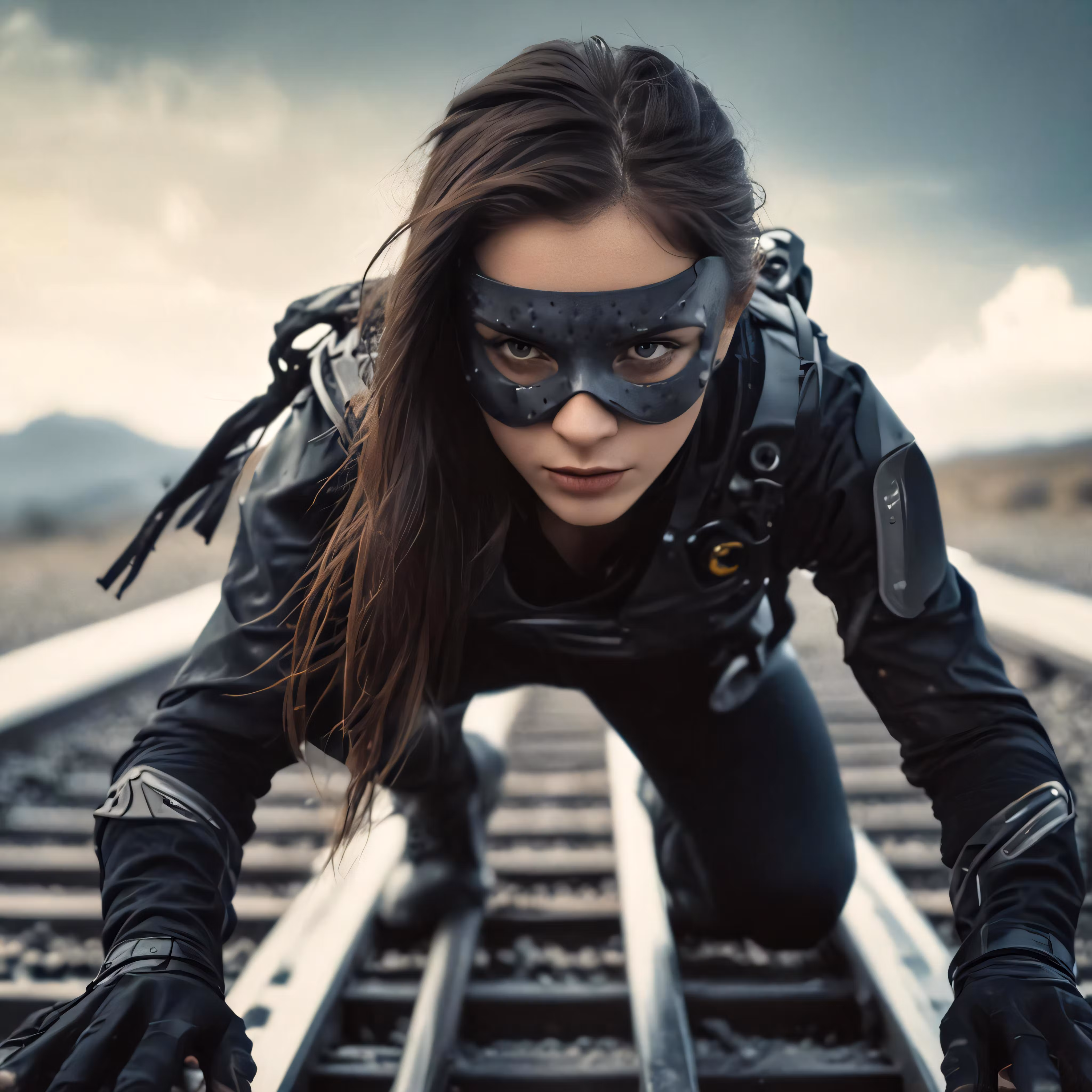 High resolution picture, free to use, an advertisement for a bicycle shop and it says 30 /a woman in black garter and catwoman mask on the train tracks