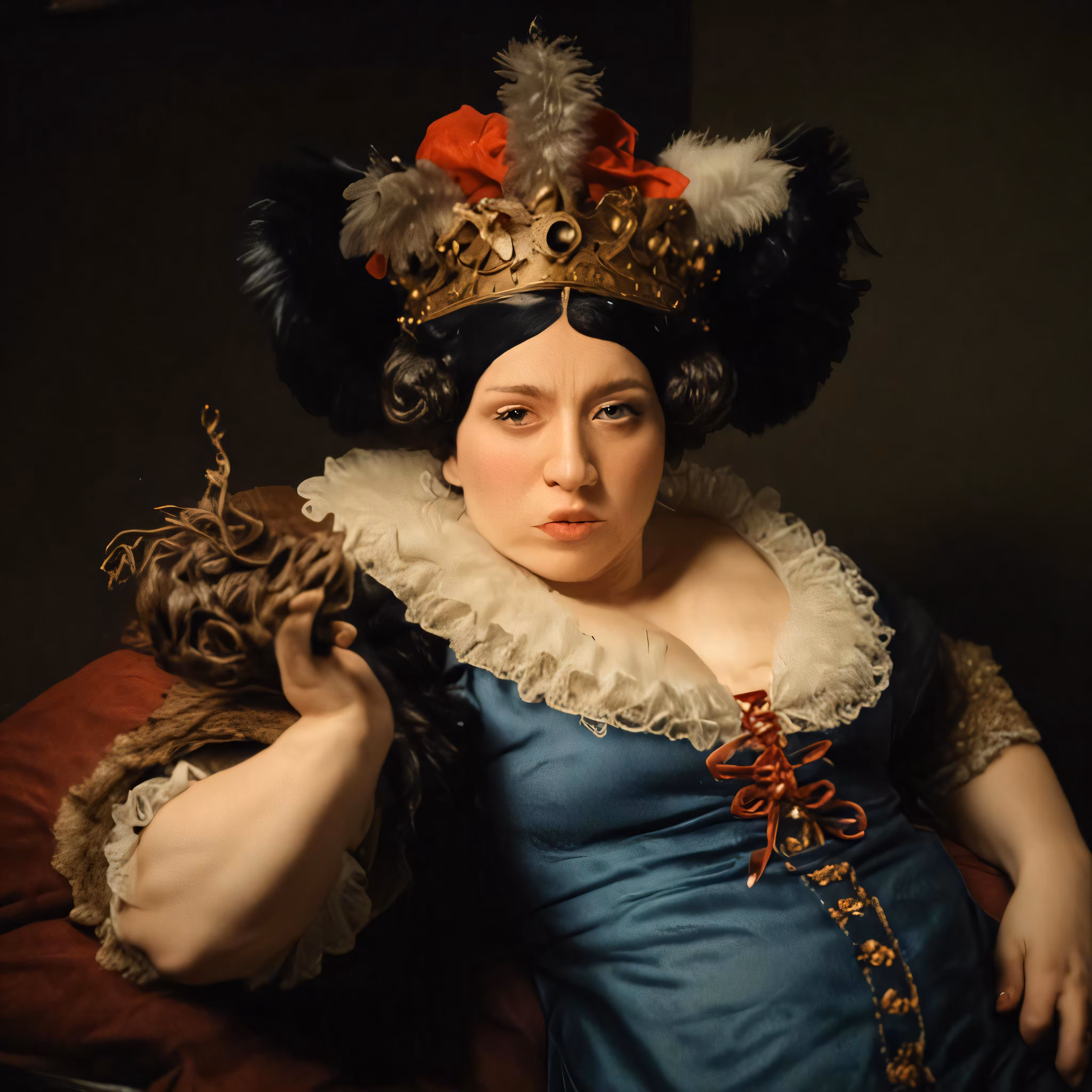 High resolution picture, free to use, an advertisement for a bicycle shop and it says 30 /a woman in renaissance garb and crown holding a stuffed bear