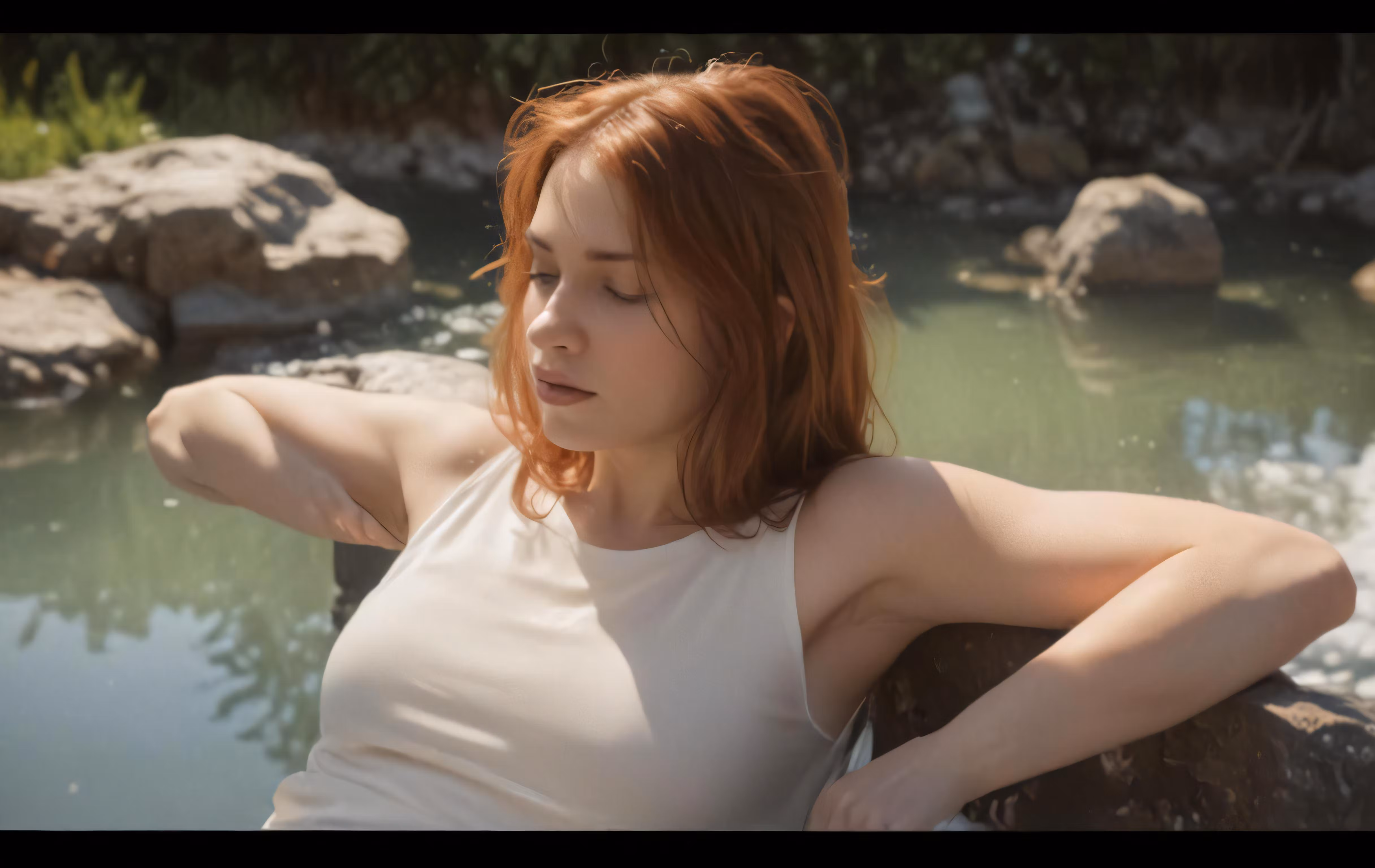 High resolution picture, free to use, an advertisement for a bicycle shop and it says 30 /a woman leaning against a rock near a body of water