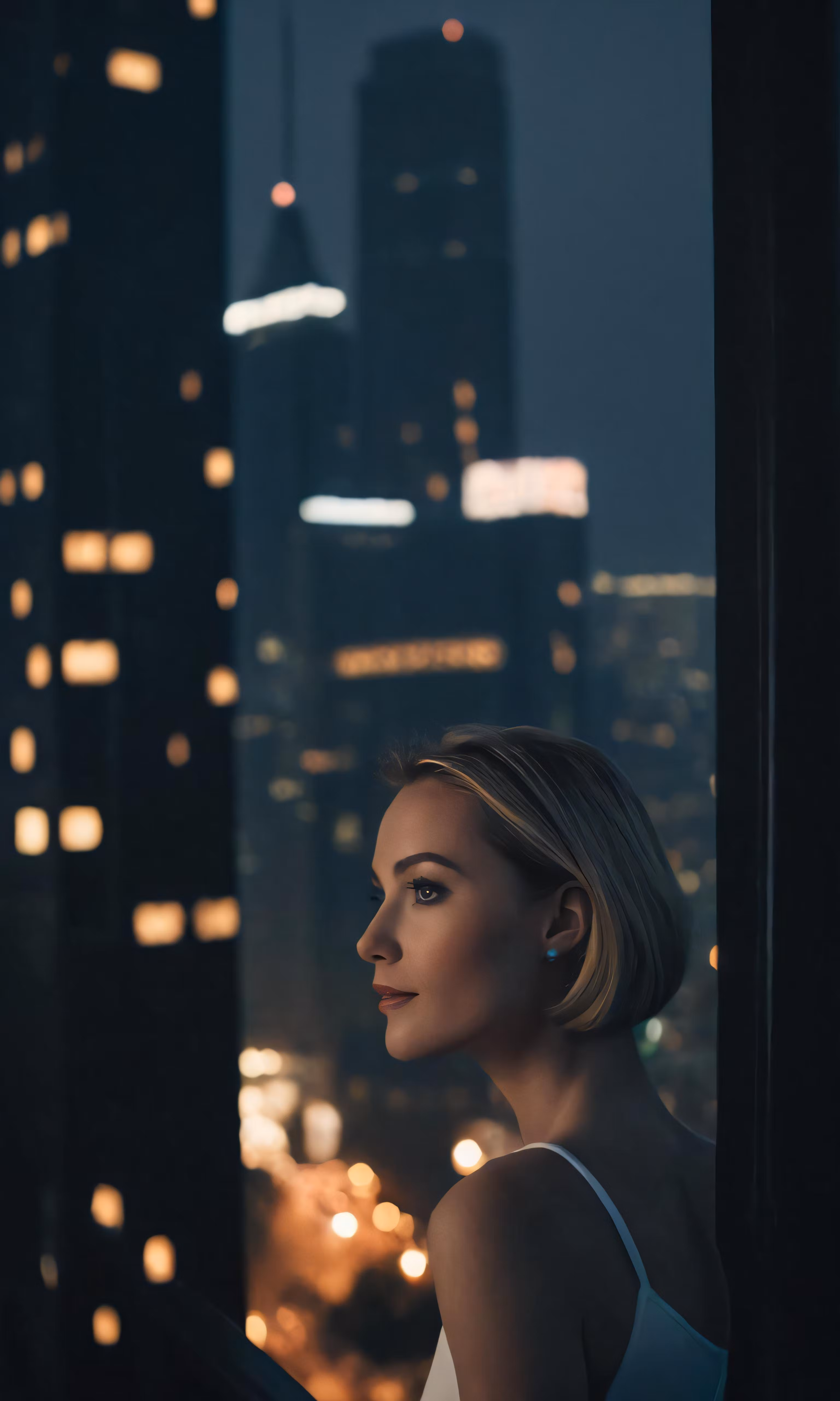 High resolution picture, free to use, an advertisement for a bicycle shop and it says 30 /a woman looks out at the skyline of a city