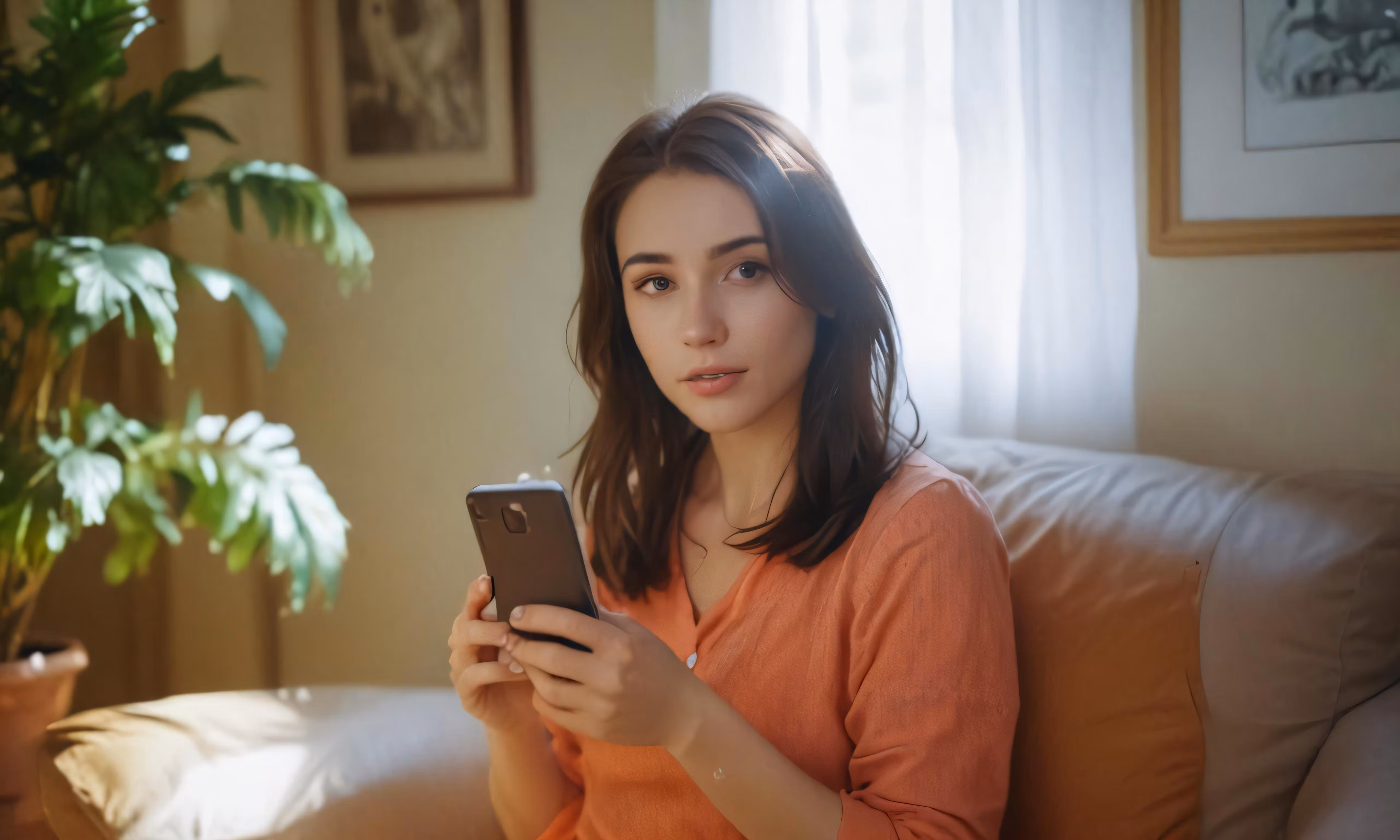 High resolution picture, free to use, an advertisement for a bicycle shop and it says 30 /a woman sitting on a couch using a smart phone