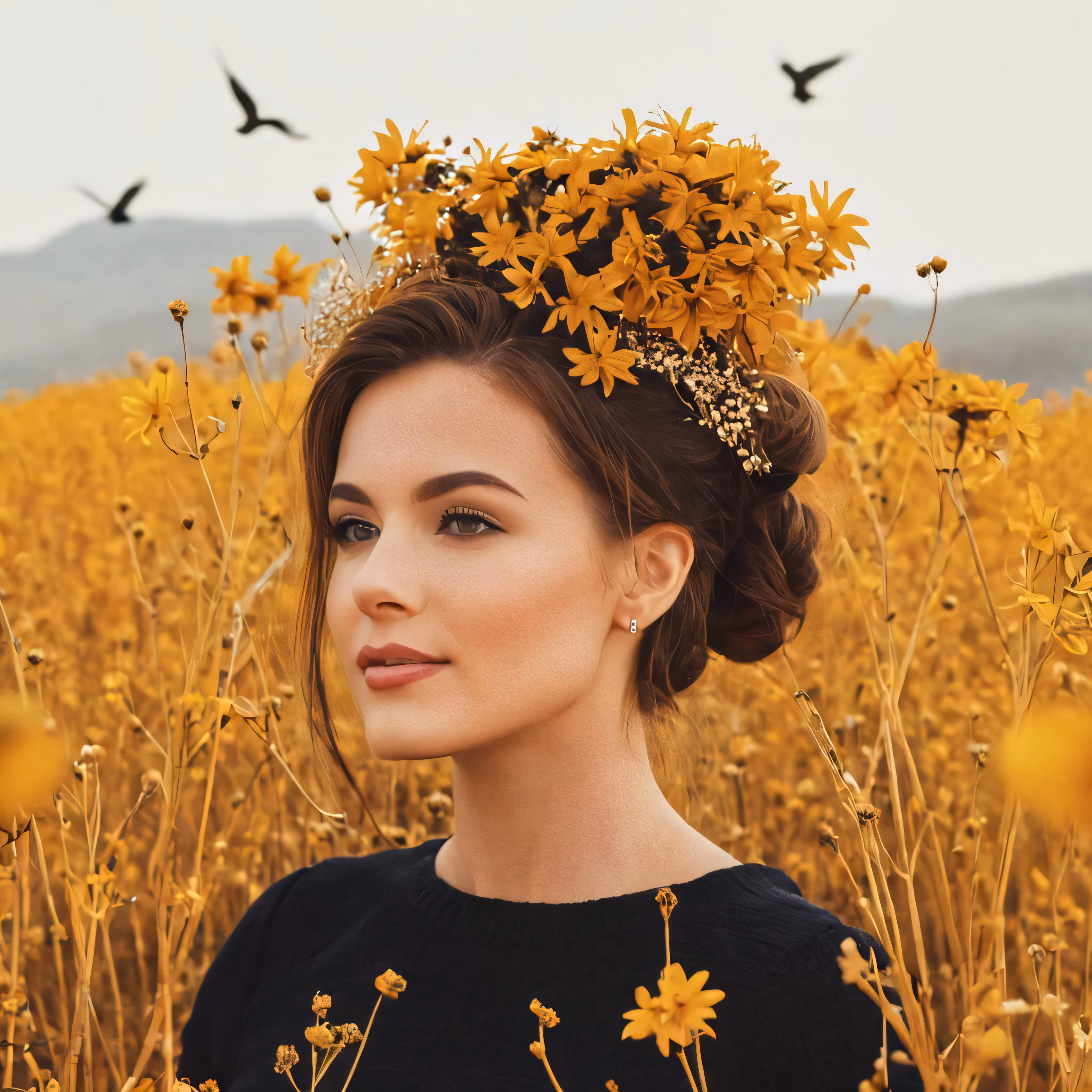 High resolution picture, free to use, an advertisement for a bicycle shop and it says 30 /a woman standing in the middle of yellow flowers