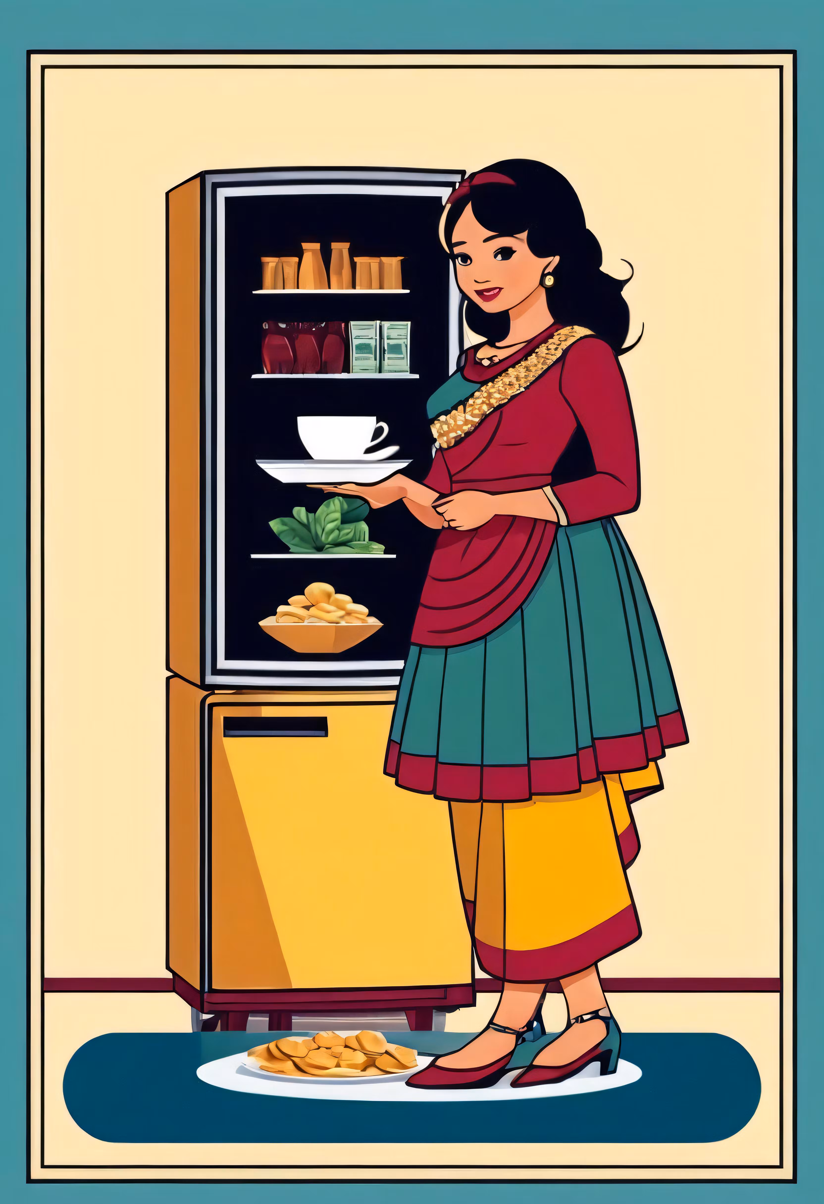 High resolution picture, free to use, an advertisement for a bicycle shop and it says 30 /a woman that is standing in front of an fridge