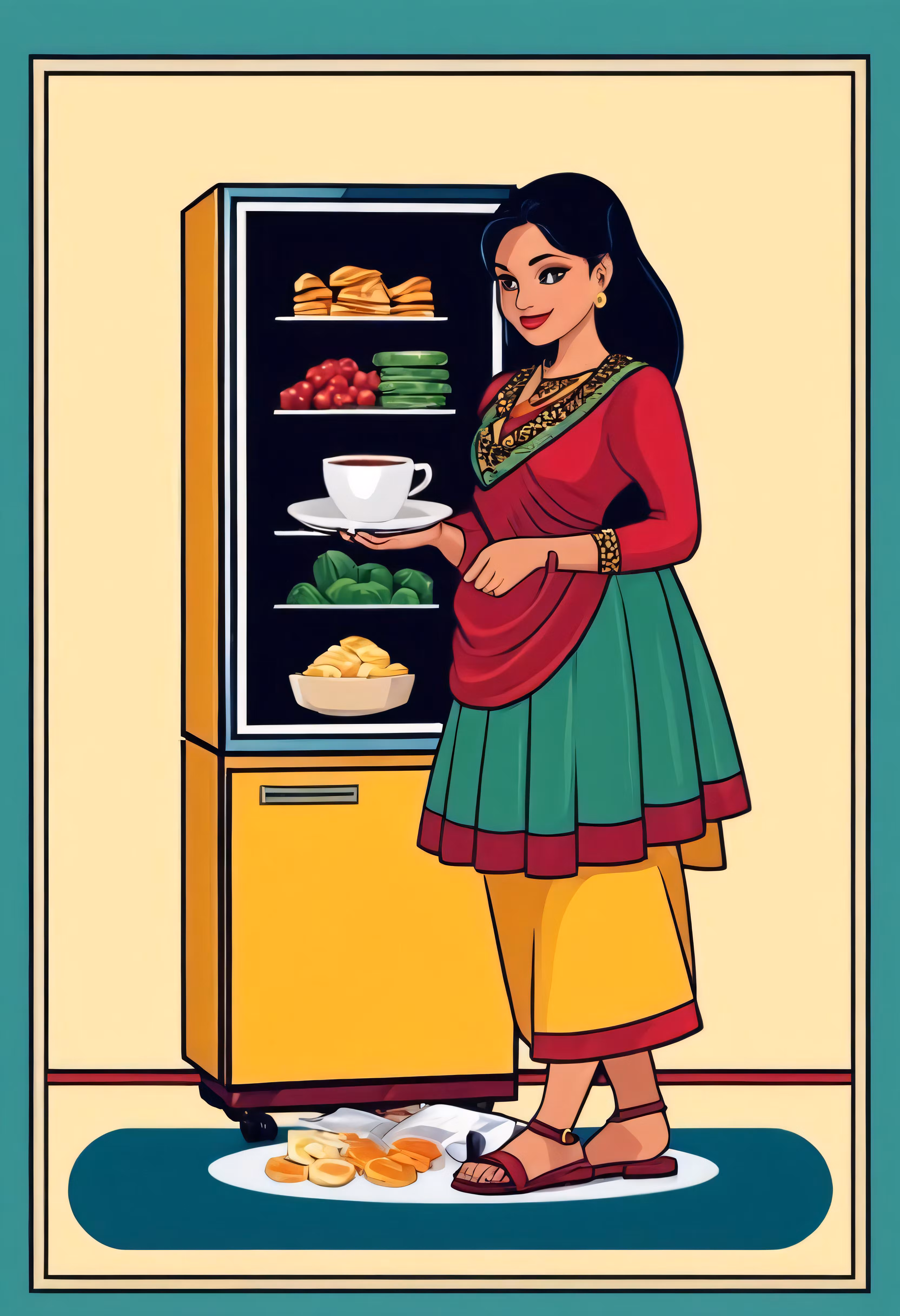 High resolution picture, free to use, an advertisement for a bicycle shop and it says 30 /a woman wearing traditional dress holding her food in front of an open refrigerator