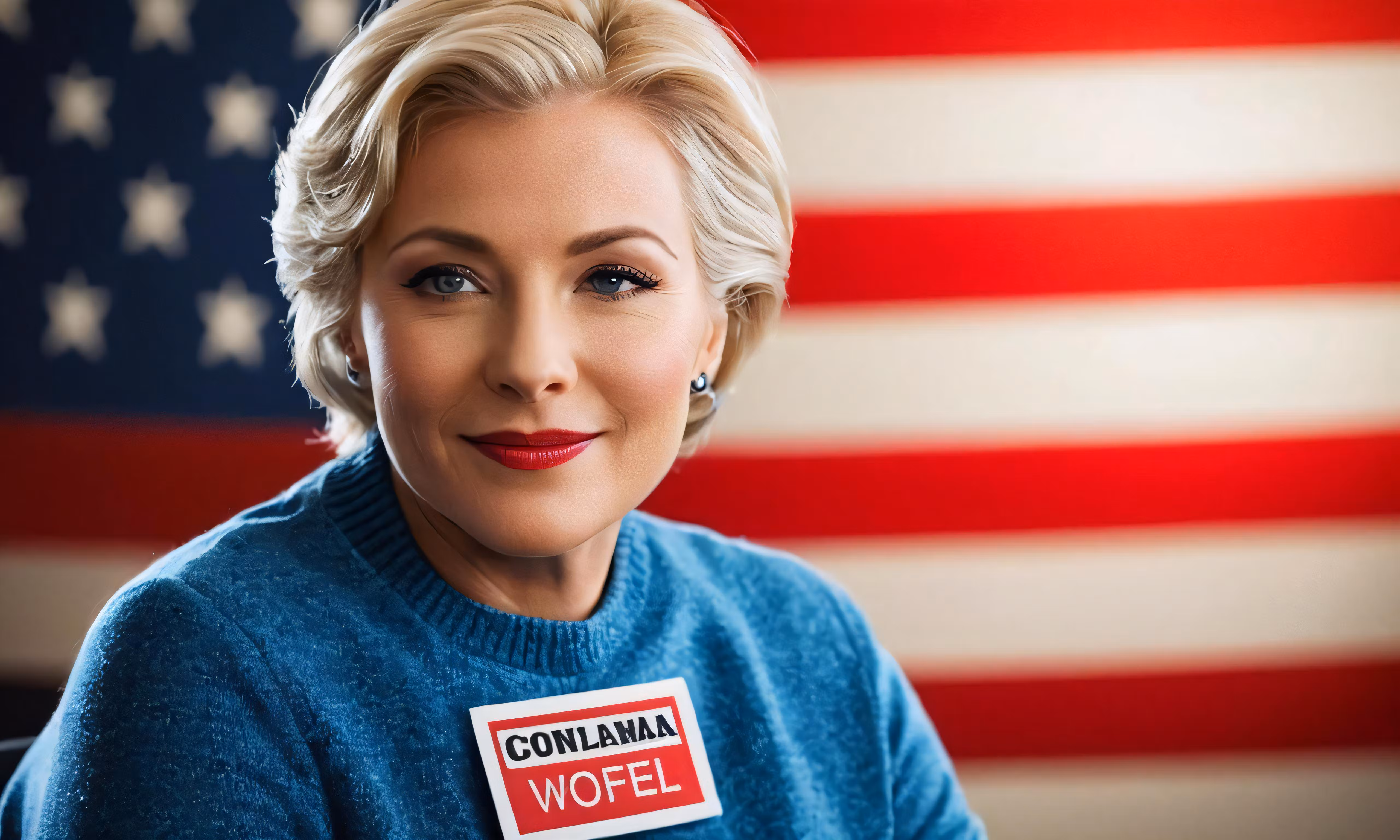 High resolution picture, free to use, an advertisement for a bicycle shop and it says 30 /a woman with blond hair holding a red and white sign in front of an american flag