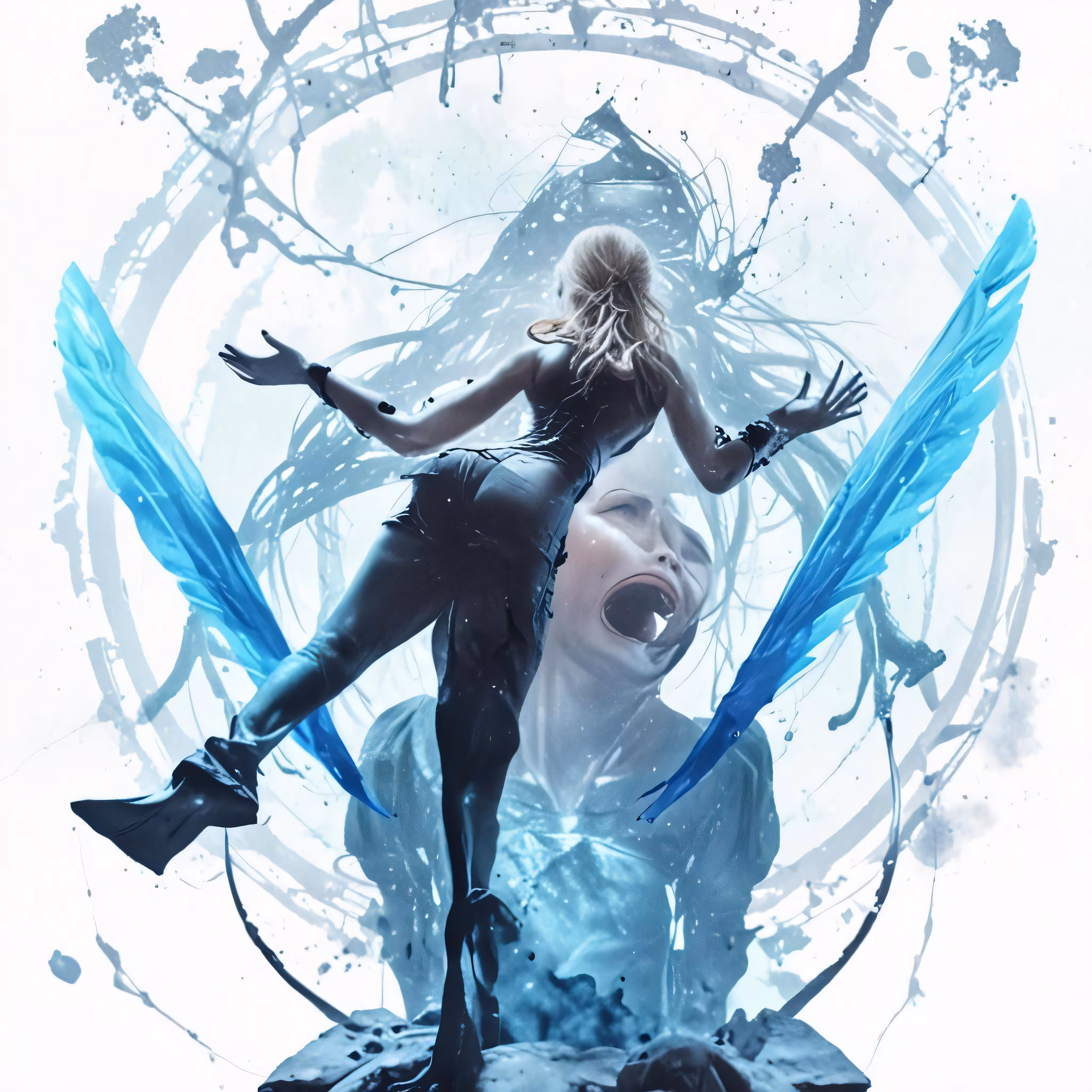 High resolution picture, free to use, an advertisement for a bicycle shop and it says 30 /an abstract woman is performing in front of a circular artwork