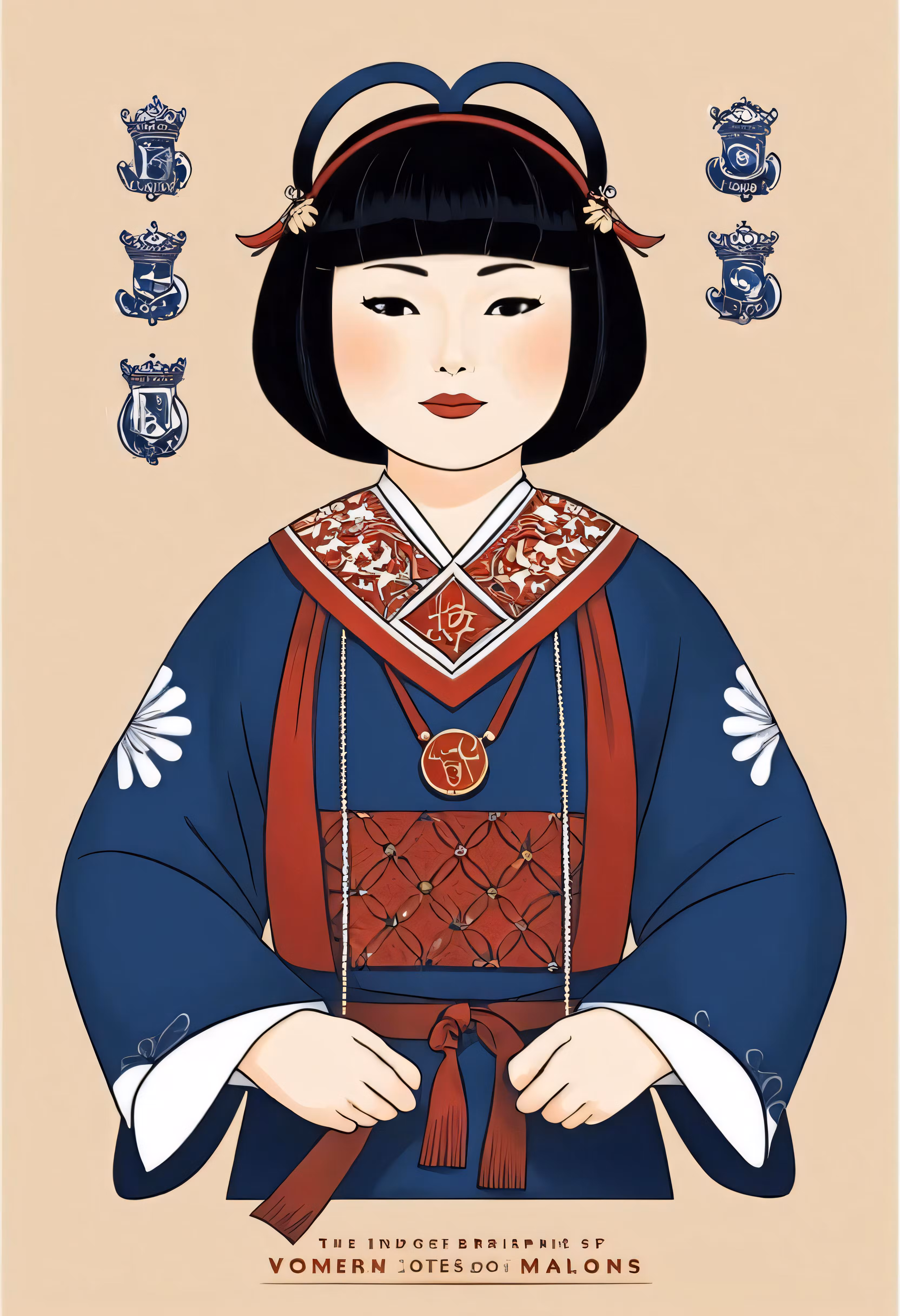 High resolution picture, free to use, an advertisement for a bicycle shop and it says 30 /an asian girl with a blue dress and red sash is holding a scroll in her hand