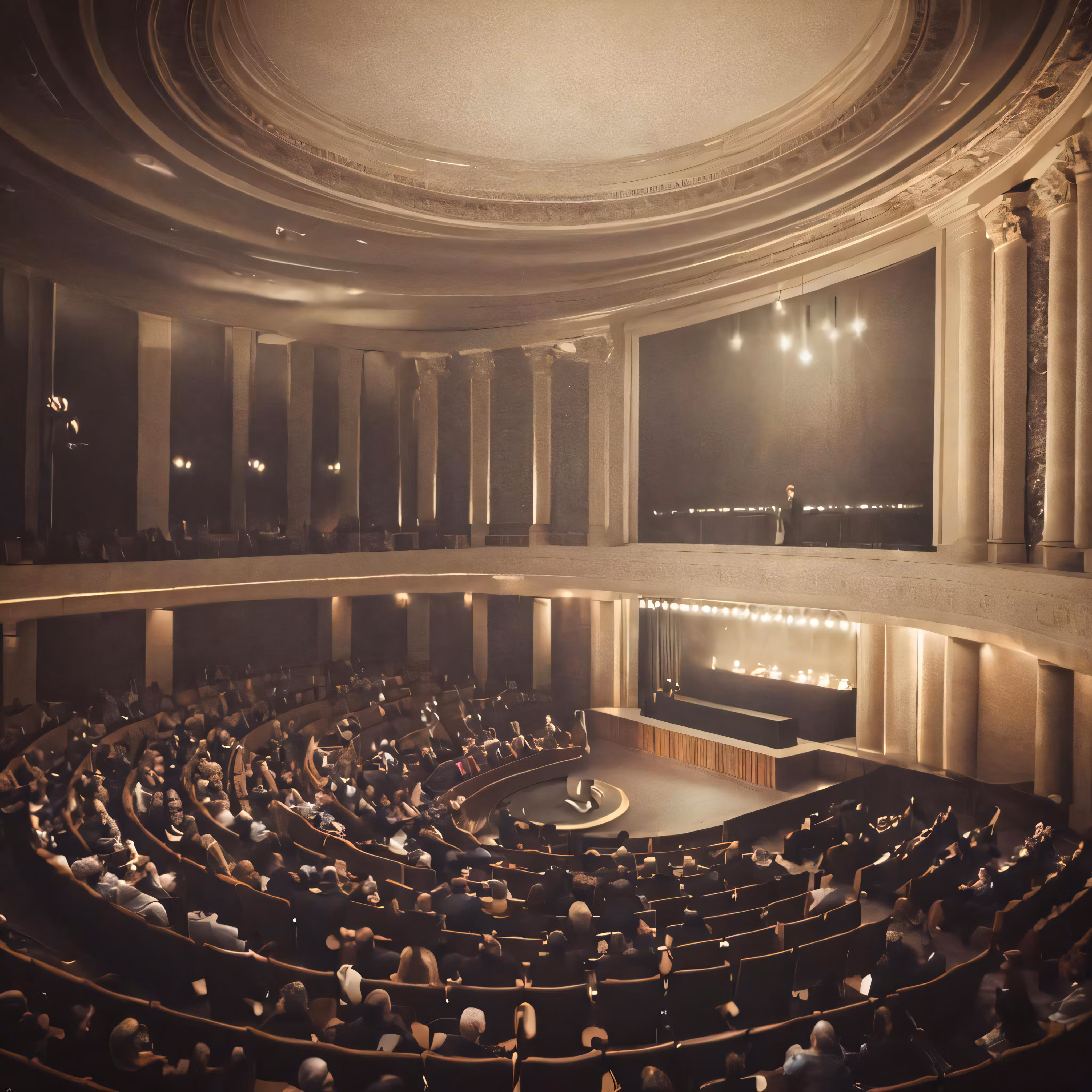 High resolution picture, free to use, an advertisement for a bicycle shop and it says 30 /an auditorium with a stage that has people seated in it