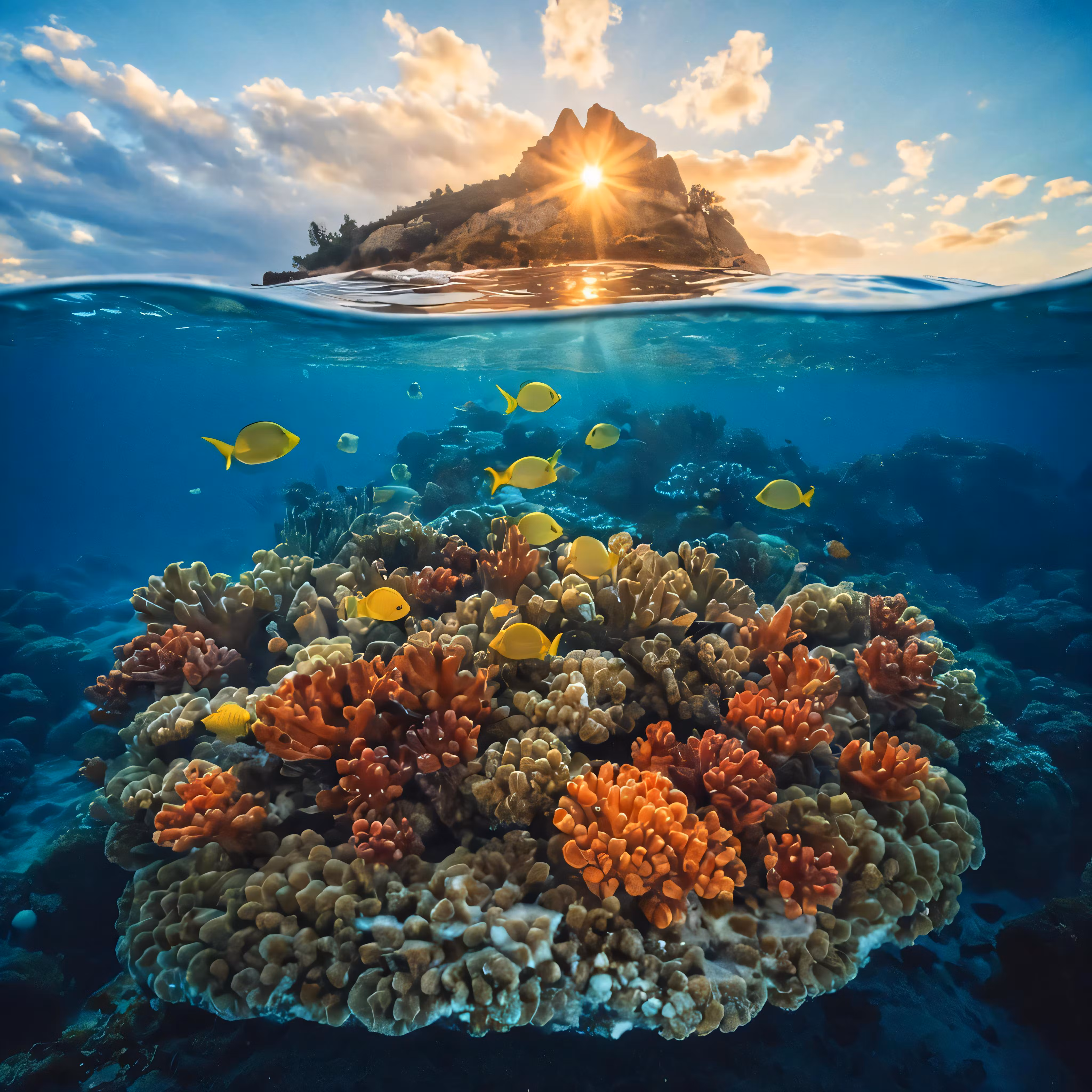 High resolution picture, free to use, an advertisement for a bicycle shop and it says 30 /an underwater view of a coral reef and a small island in the background