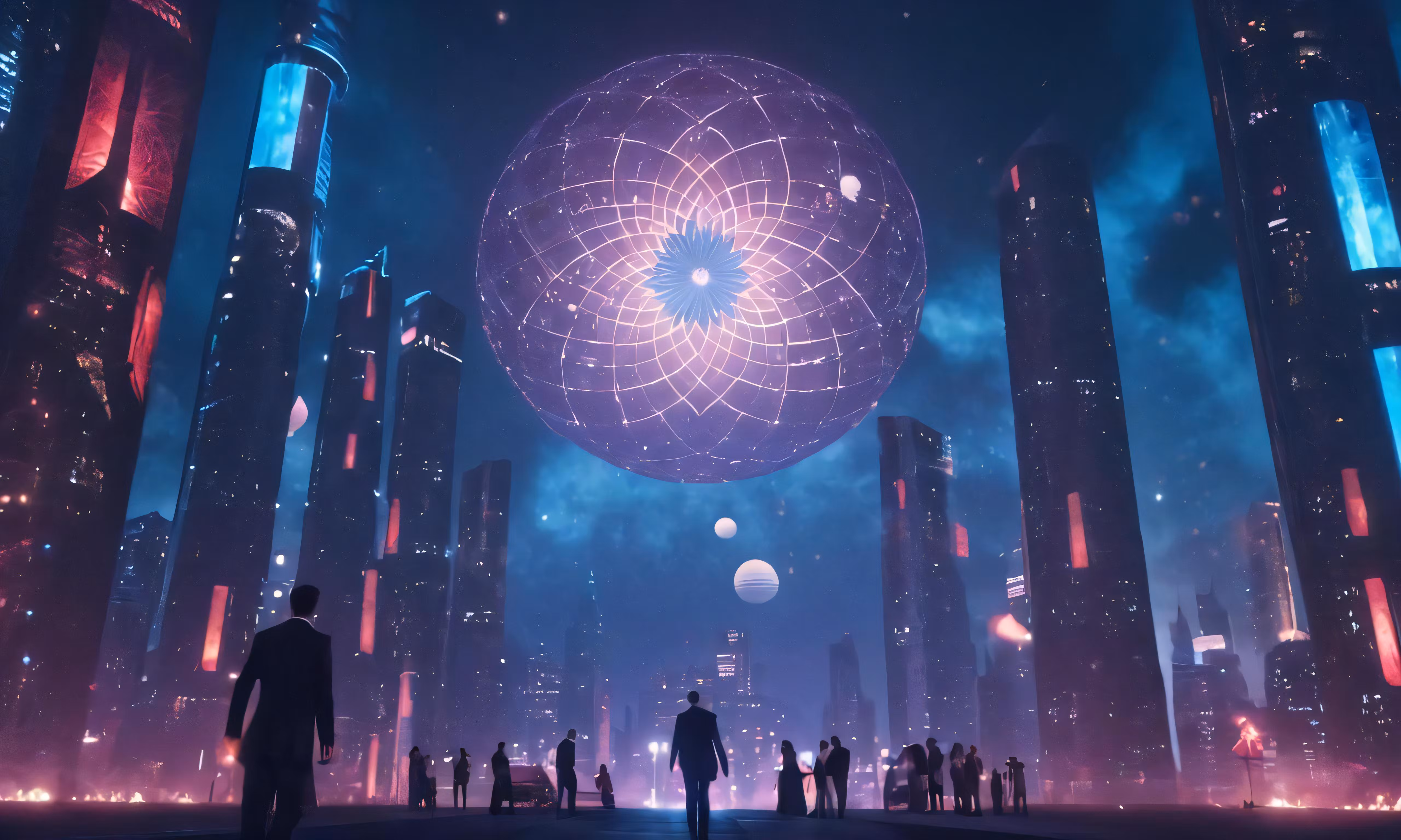 High resolution picture, free to use, an advertisement for a bicycle shop and it says 30 /futuristic cityscape with large structure above