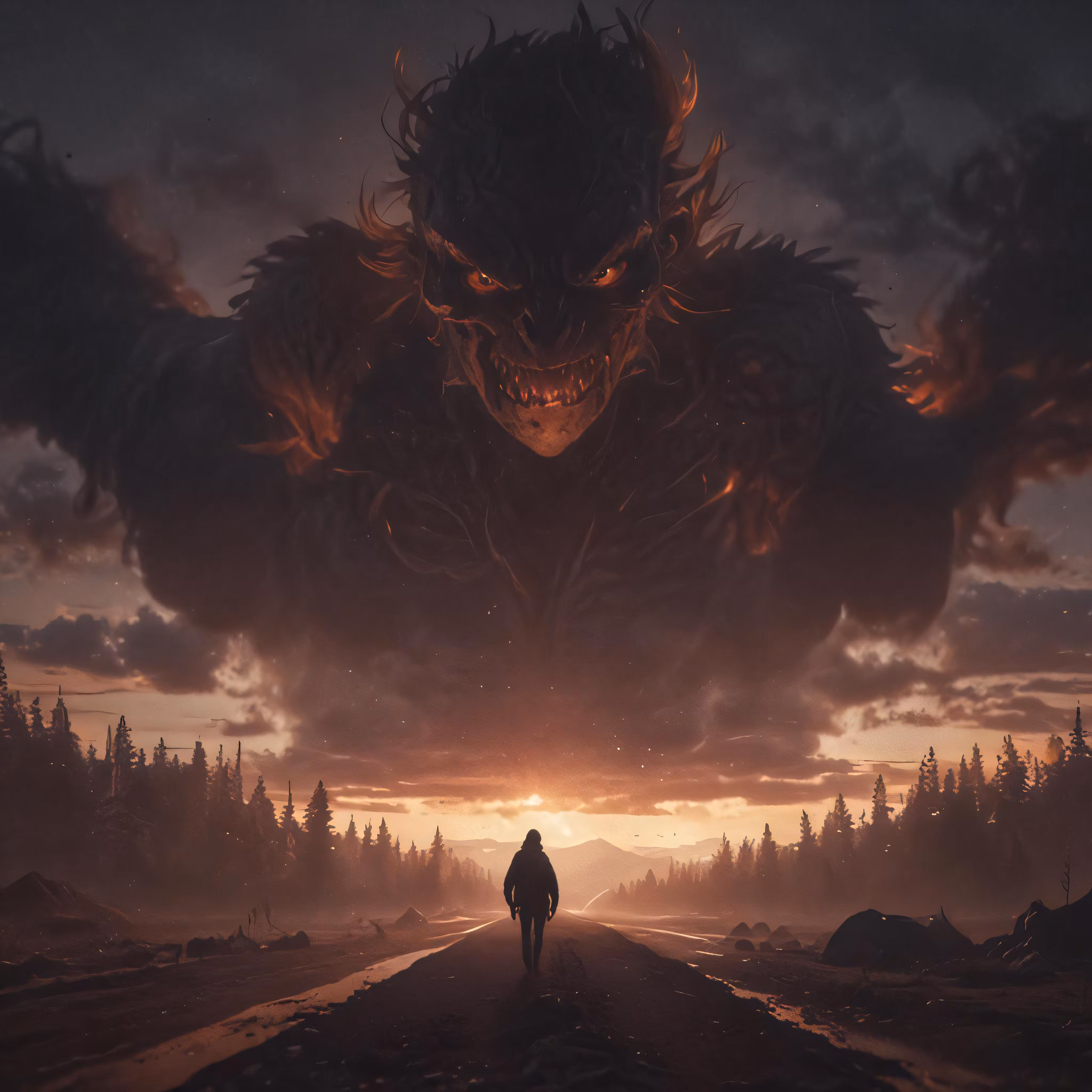 High resolution picture, free to use, an advertisement for a bicycle shop and it says 30 /man looking down on a dark monster like figure