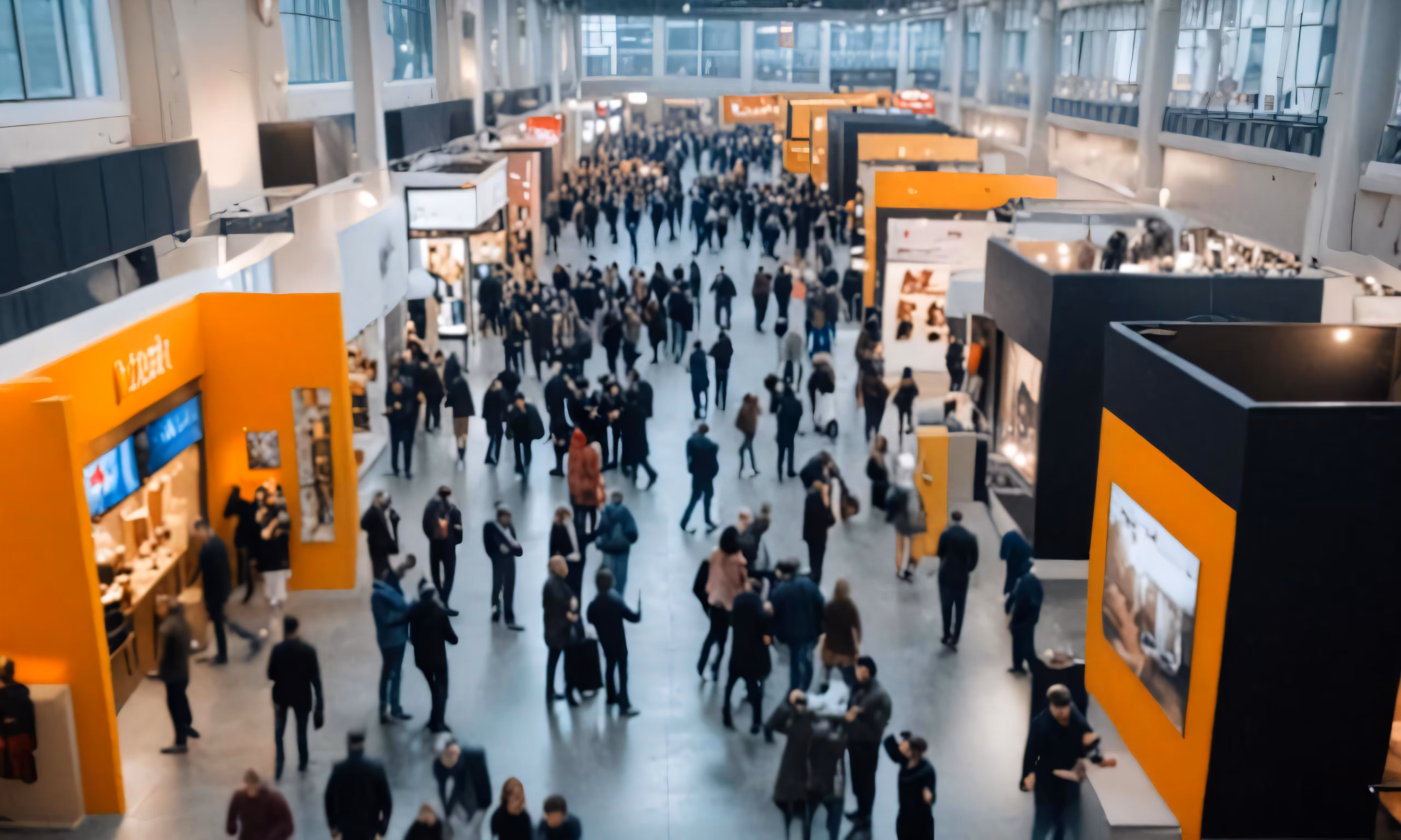 High resolution picture, free to use, an advertisement for a bicycle shop and it says 30 /many people walk around a large yellow exhibition