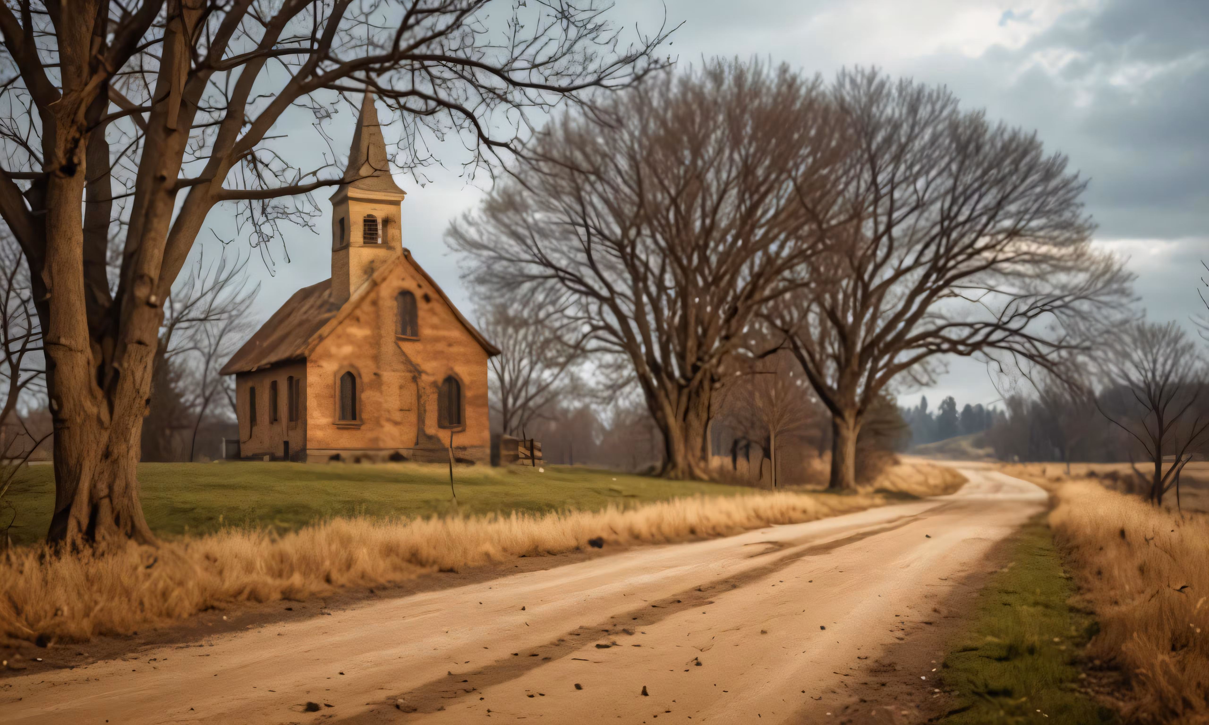 High resolution picture, free to use, an advertisement for a bicycle shop and it says 30 /old church with dirt road in rural area