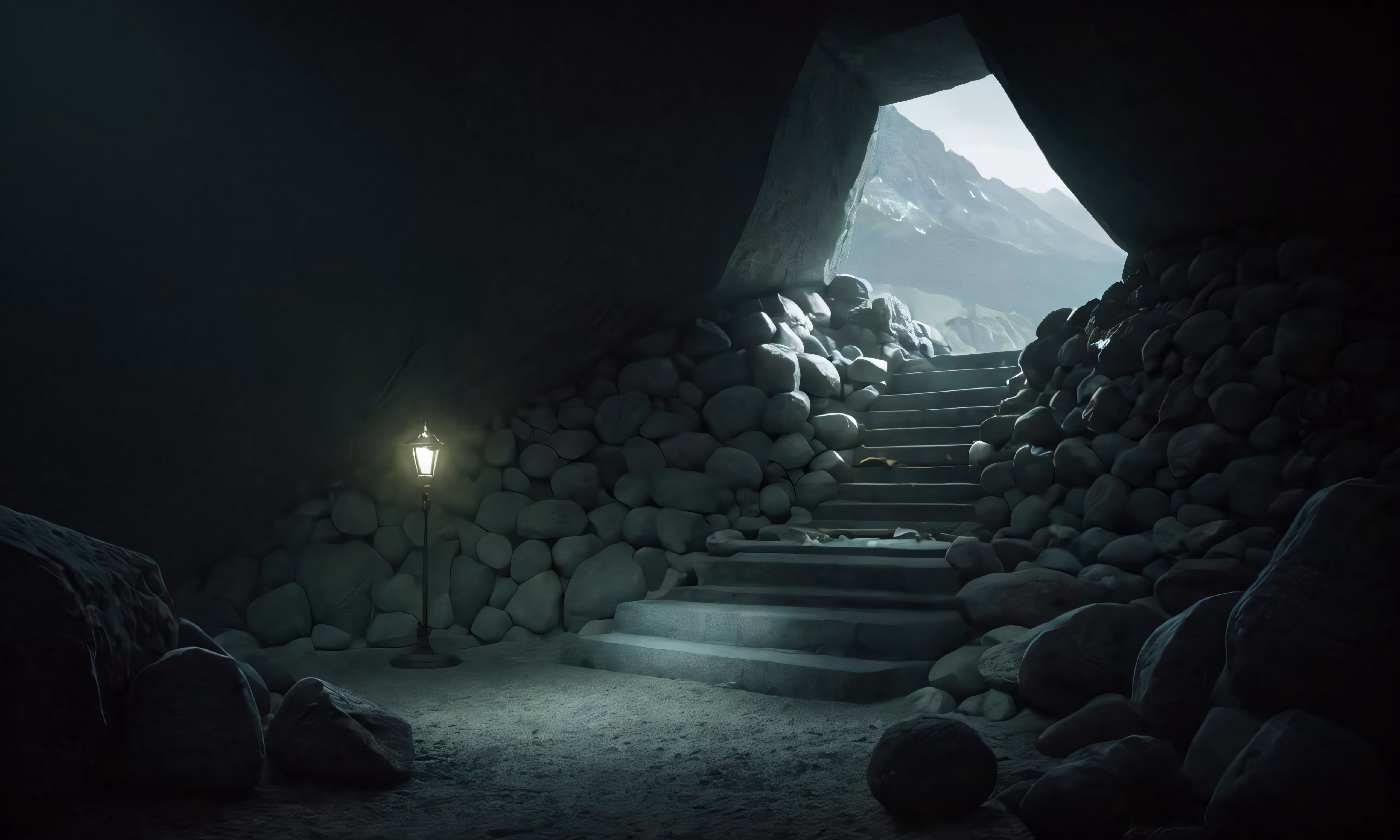 High resolution picture, free to use, an advertisement for a bicycle shop and it says 30 /some stairs going into a dark cave with a light on