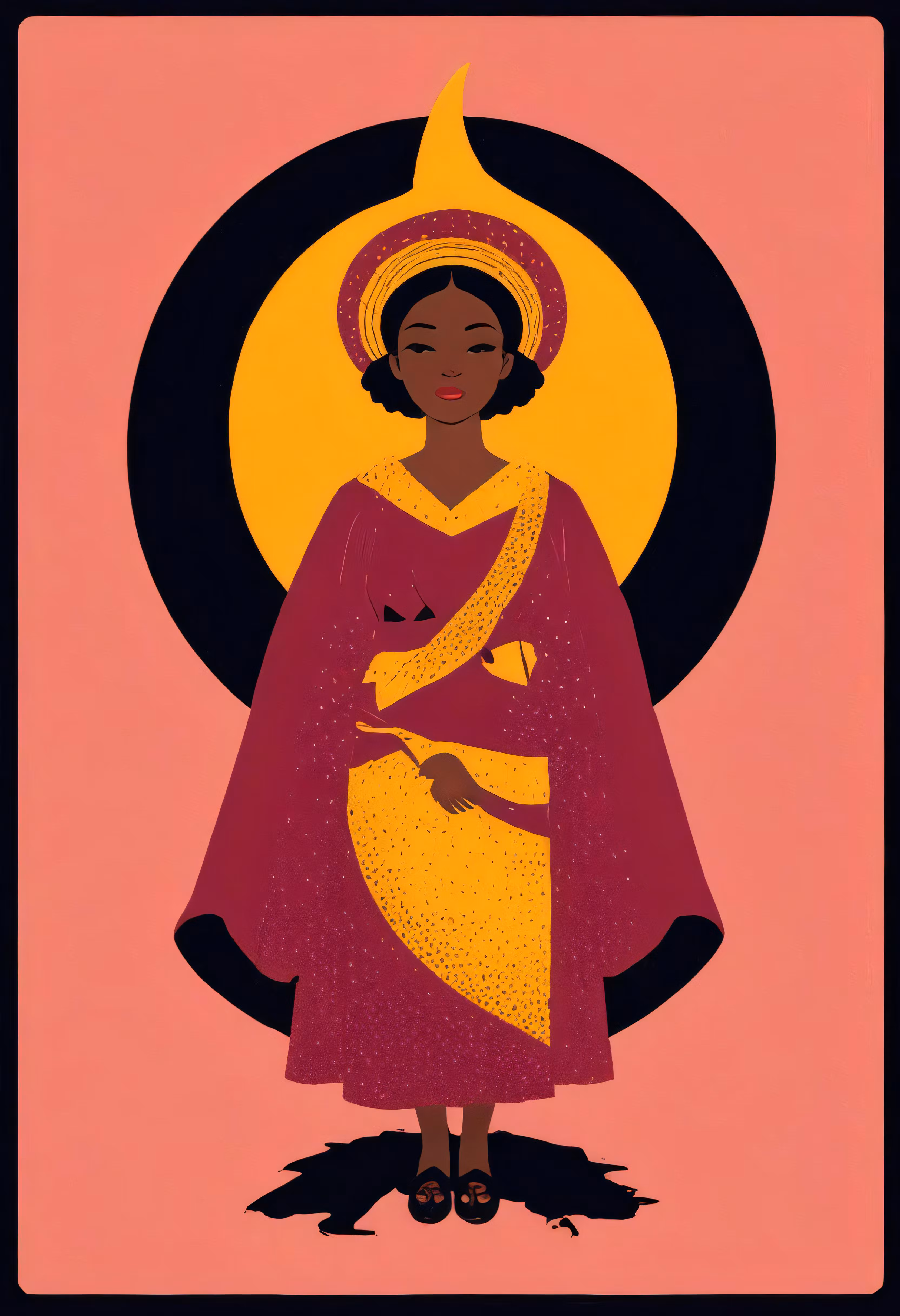High resolution picture, free to use, an advertisement for a bicycle shop and it says 30 /the african woman in red and yellow is holding a large round object