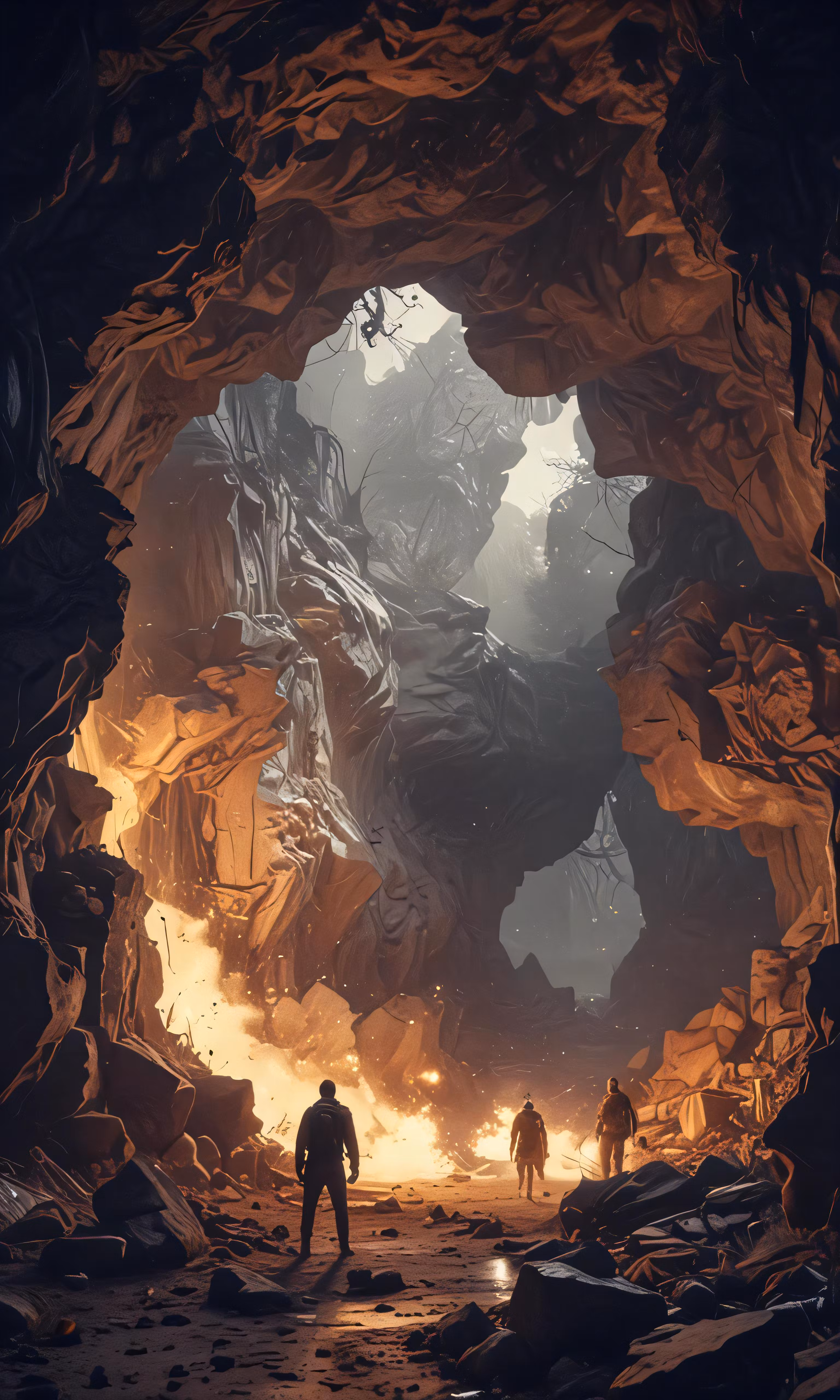 High resolution picture, free to use, an advertisement for a bicycle shop and it says 30 /the entrance to a cave at night with four people standing in the cave