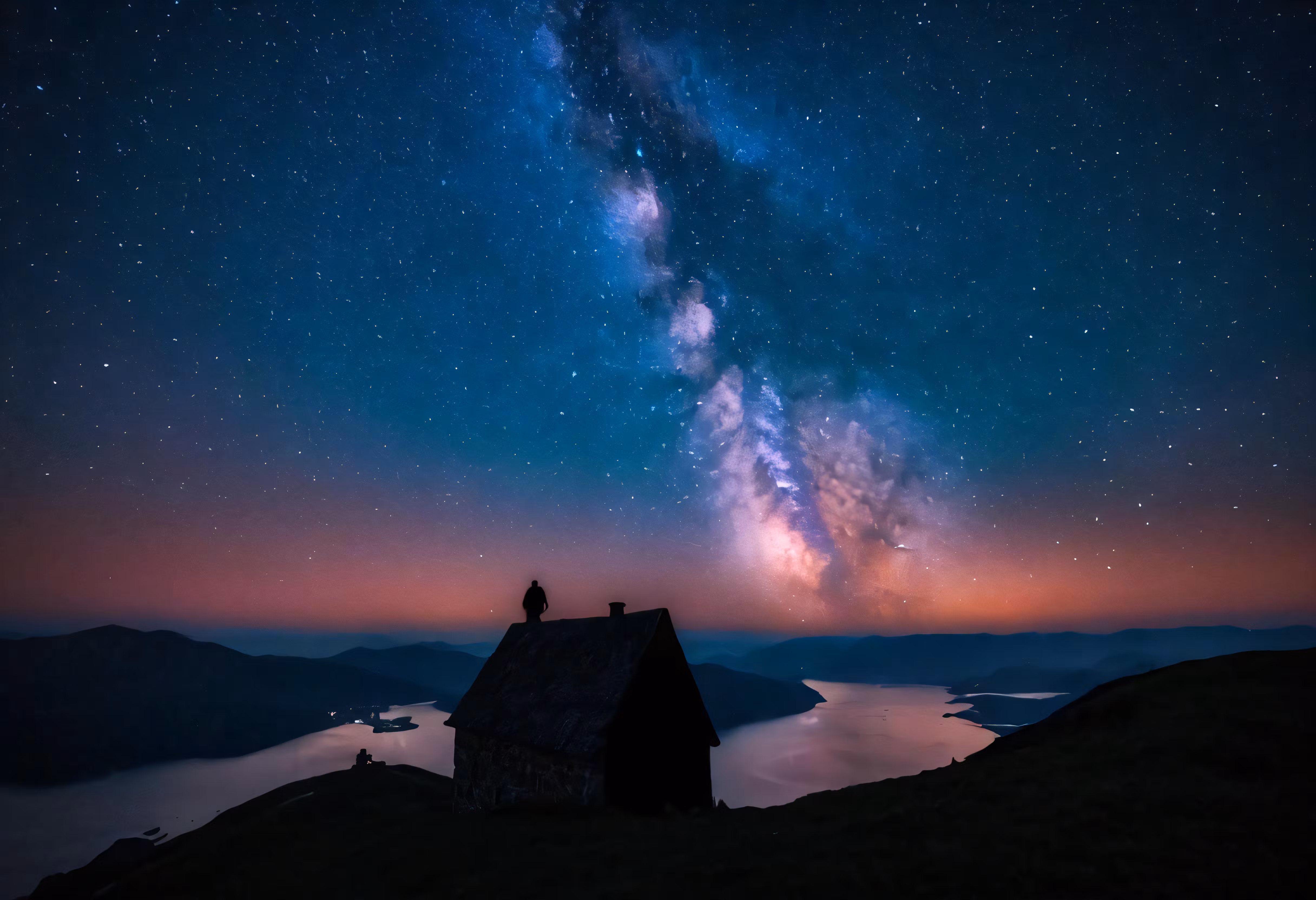 High resolution picture, free to use, an advertisement for a bicycle shop and it says 30 /the milky over a cabin on the side of a hill