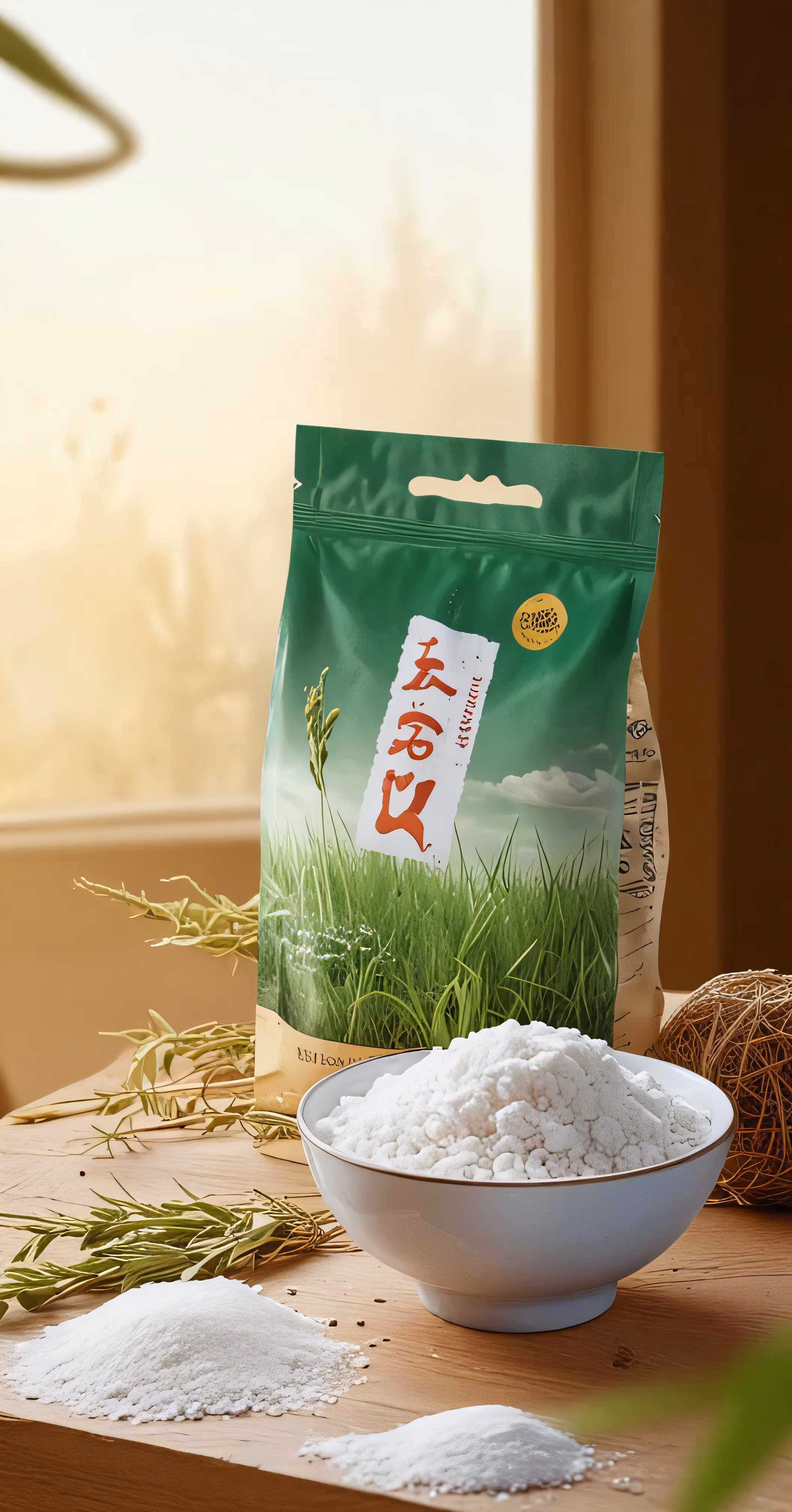 High resolution picture, free to use, an advertisement for a bicycle shop and it says 30 /the radio has an am /a bunch of green rice in a bag and two bowls with rice on a table