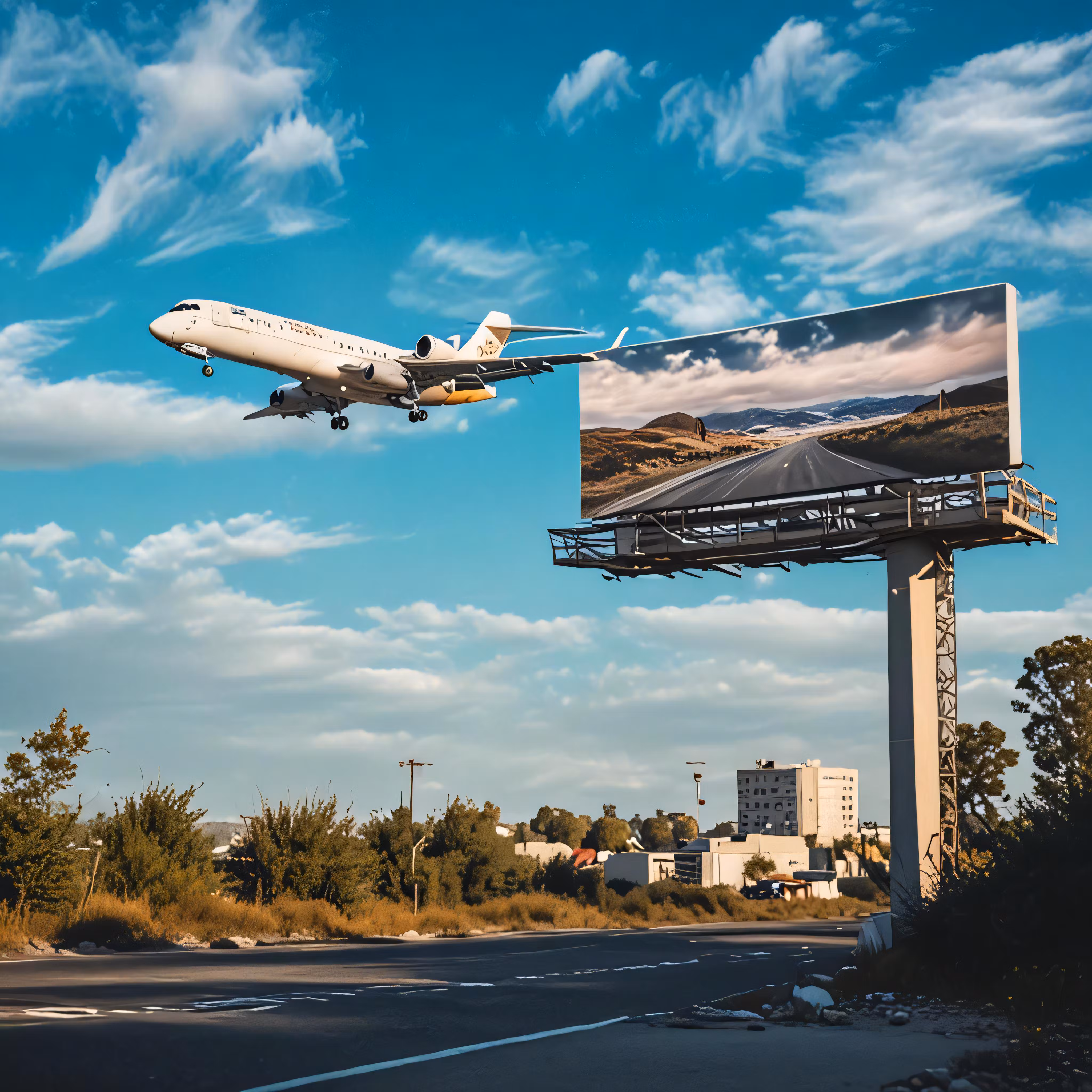 High resolution picture, free to use, an advertisement for a bicycle shop and it says 30 /the radio has an am /an airplane flying above the airport with sky in background