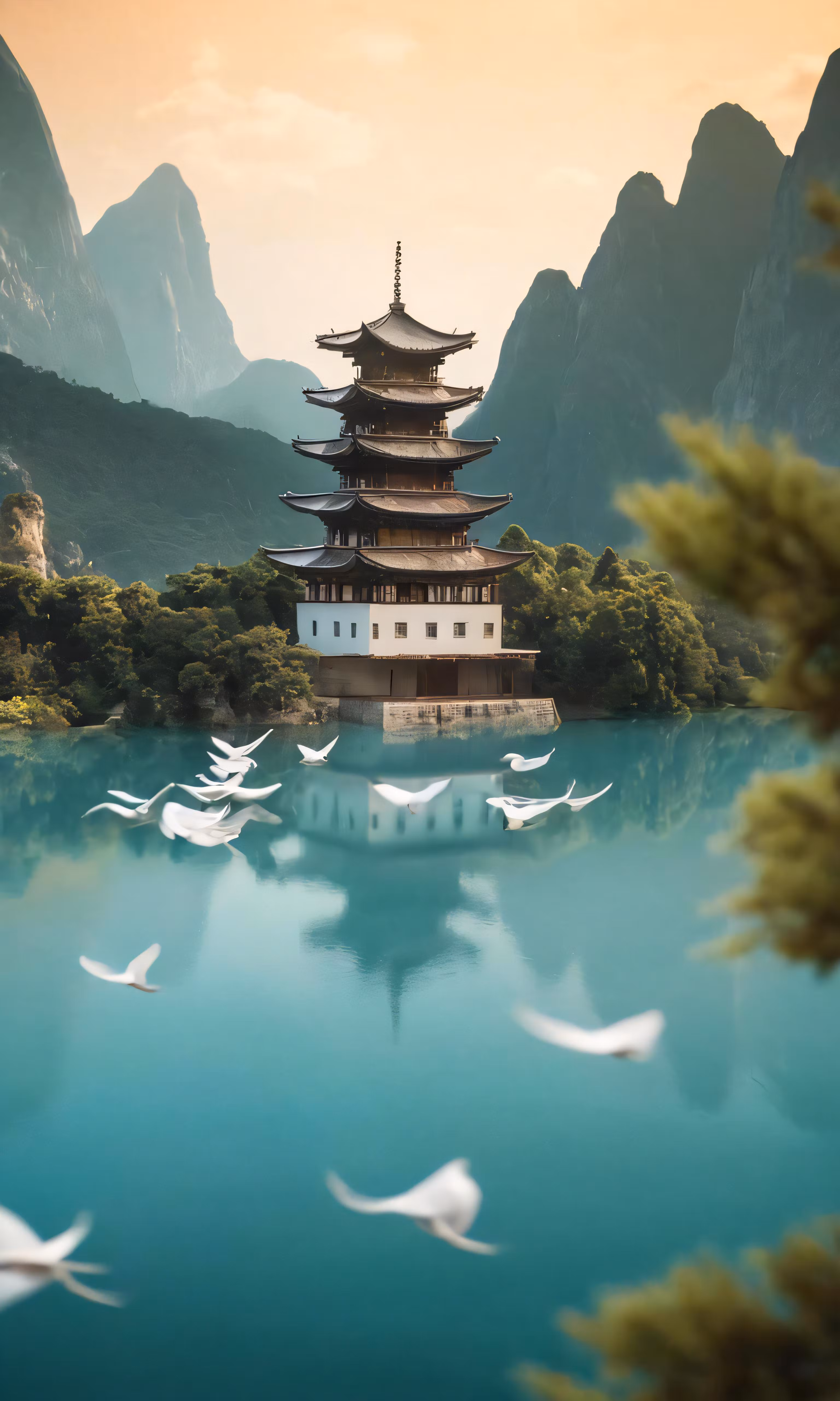 High resolution picture, free to use, an advertisement for a bicycle shop and it says 30 /the radio has an am /birds fly around an oriental structure surrounded by mountains