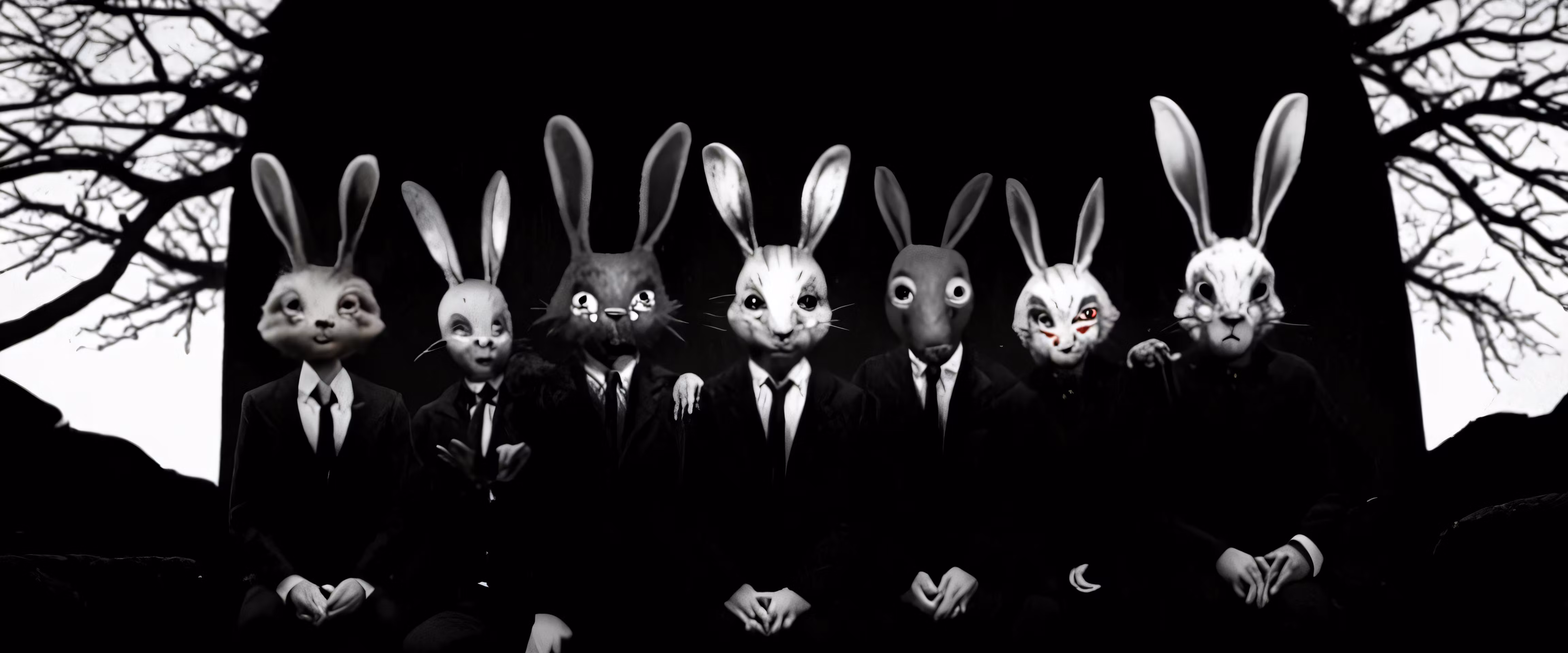 High resolution picture, free to use, an advertisement for a bicycle shop and it says 30 /the radio has an am /six rabbits in suits and ties standing near one another