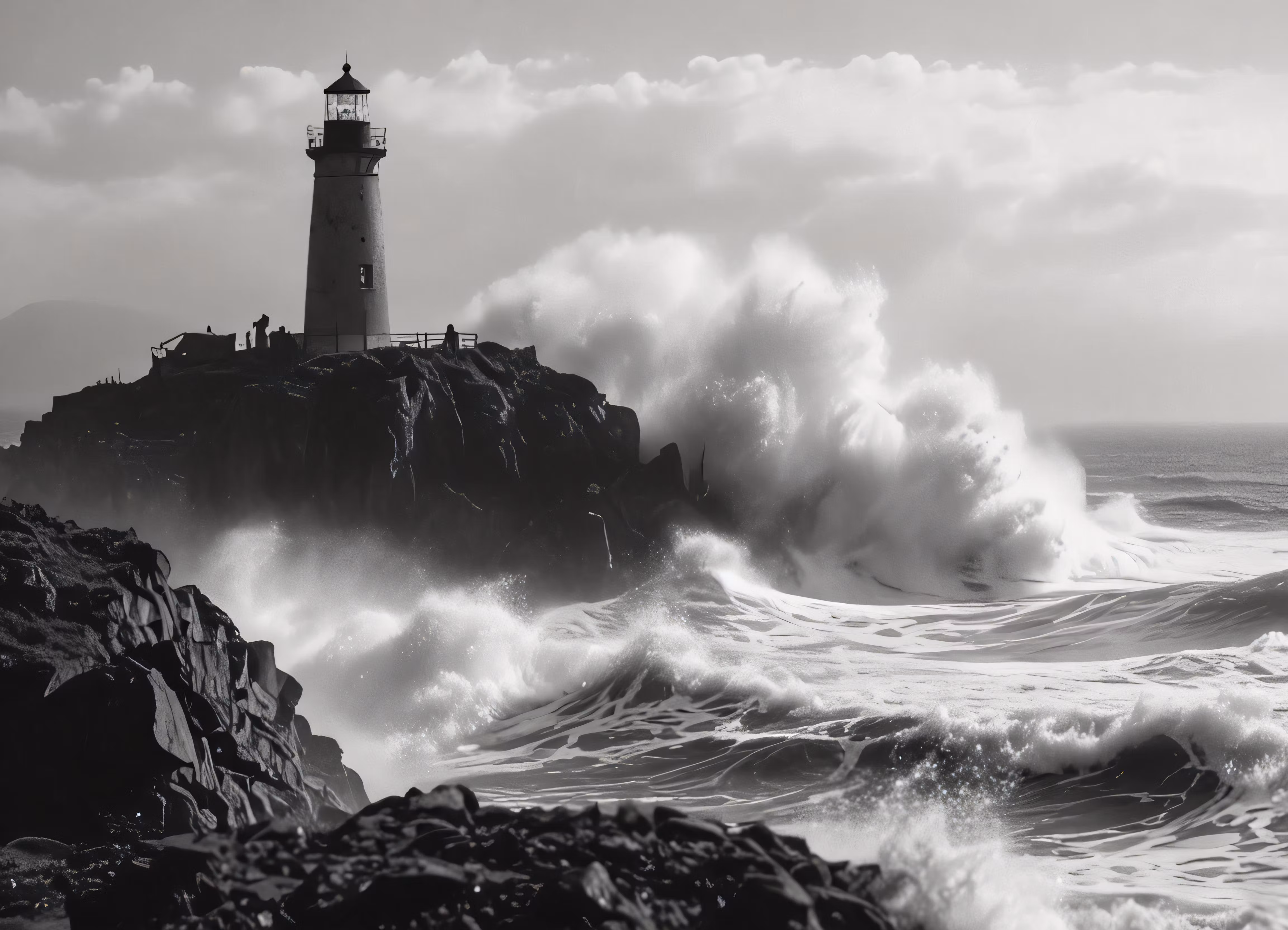 High resolution picture, free to use, an advertisement for a bicycle shop and it says 30 /the radio has an am /the lighthouse is next to a very big wave