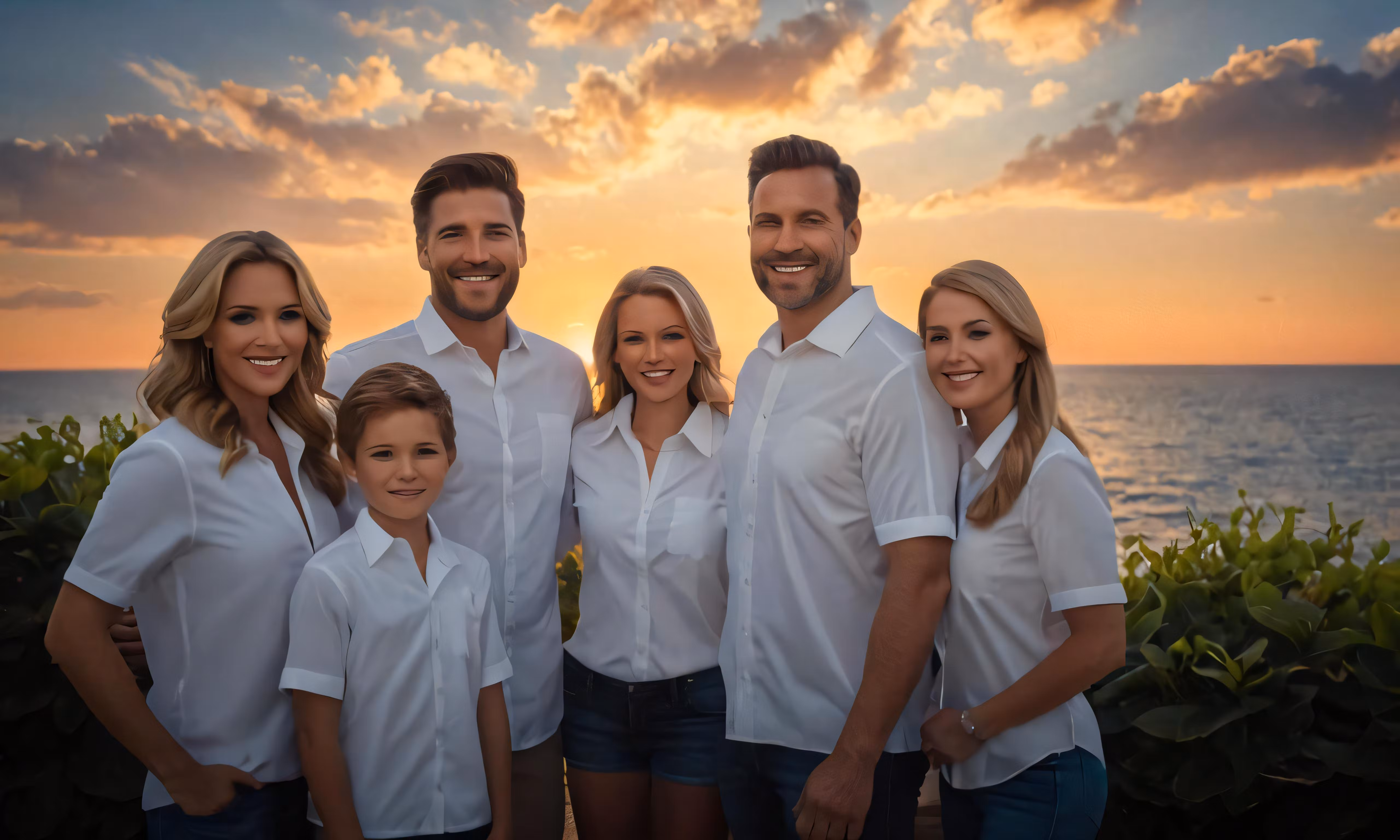 High resolution picture, free to use, an advertisement for a bicycle shop and it says 30 /this family is posing for a photo in front of the ocean