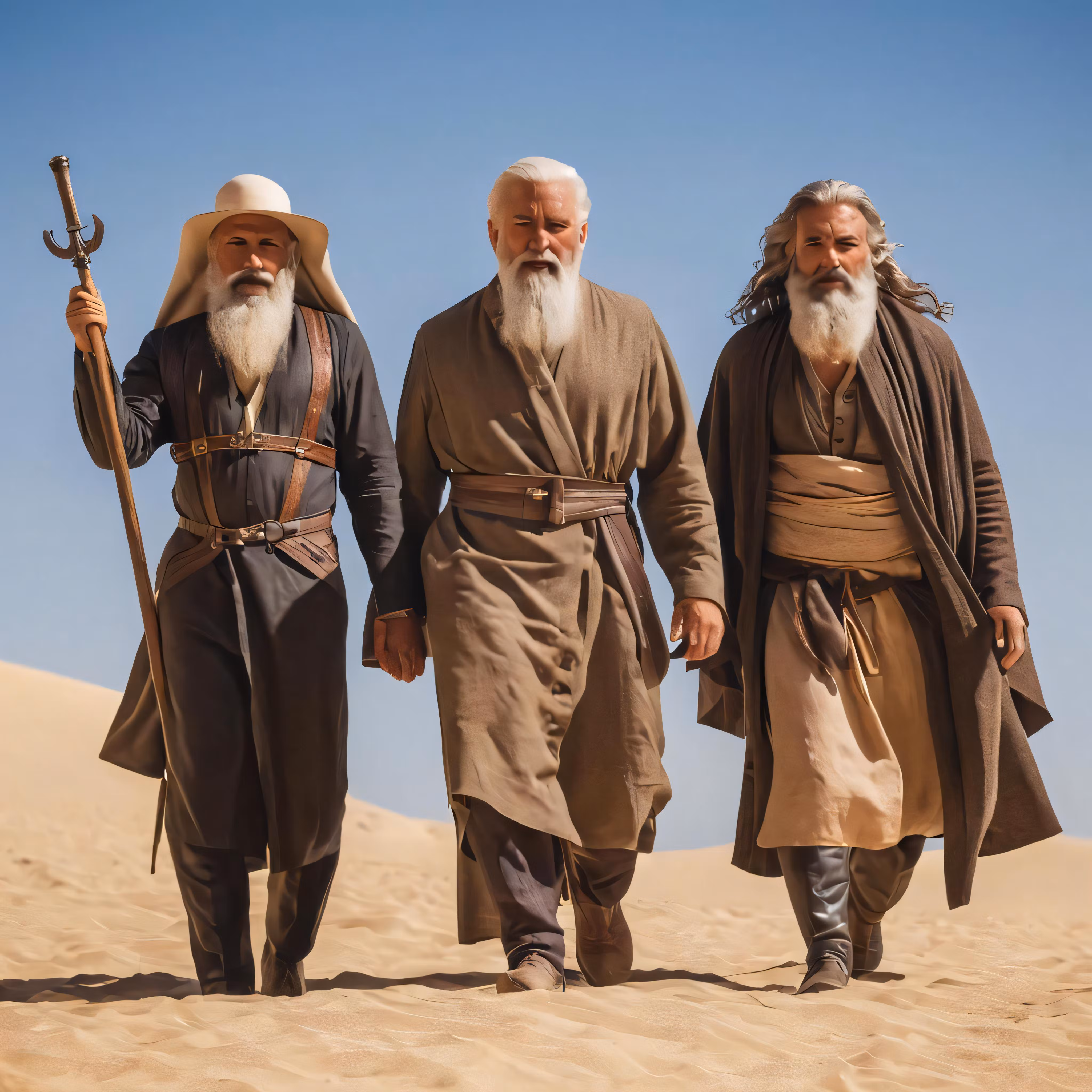 High resolution picture, free to use, an advertisement for a bicycle shop and it says 30 /three men in costumes walking through the desert