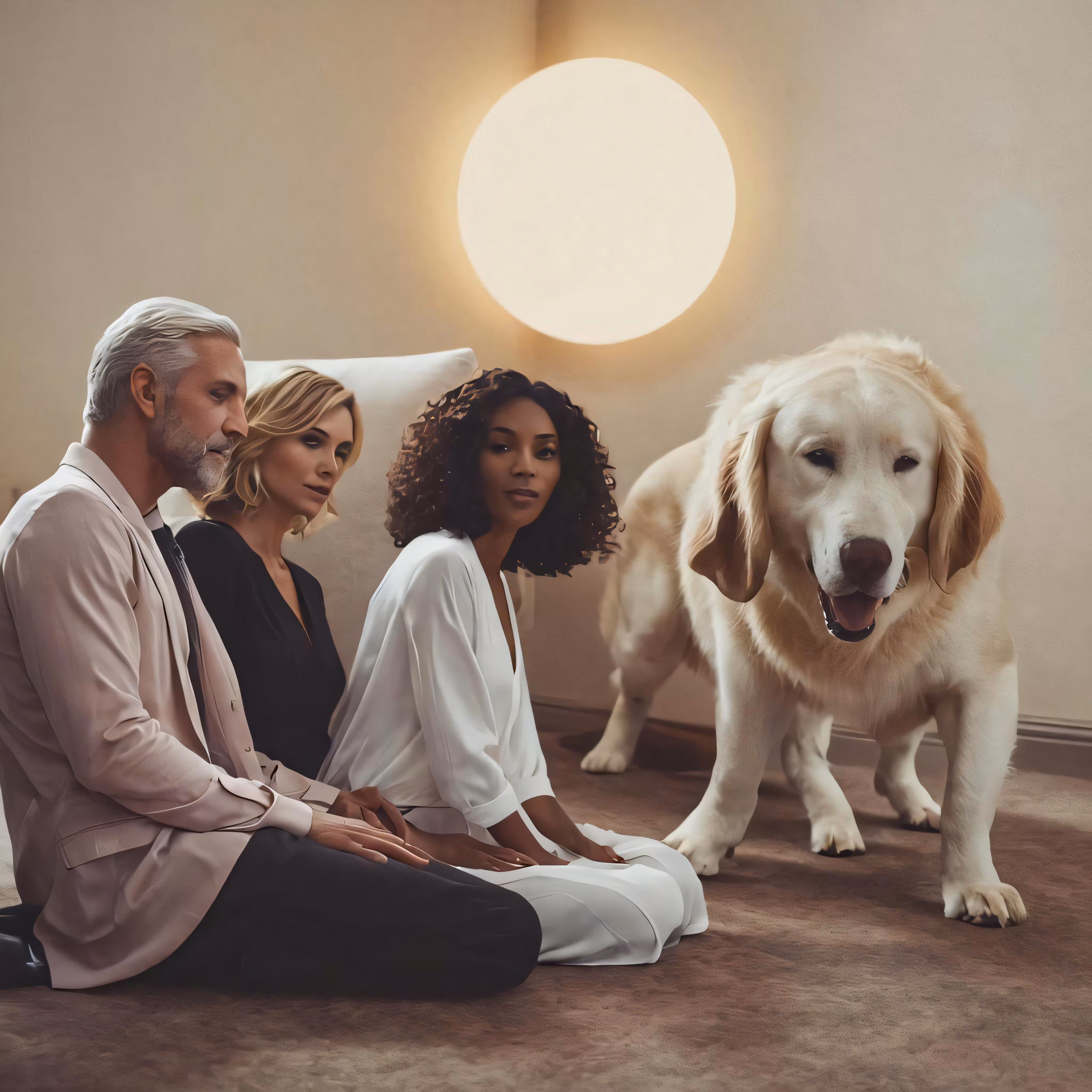 High resolution picture, free to use, an advertisement for a bicycle shop and it says 30 /three people are sitting down next to a dog