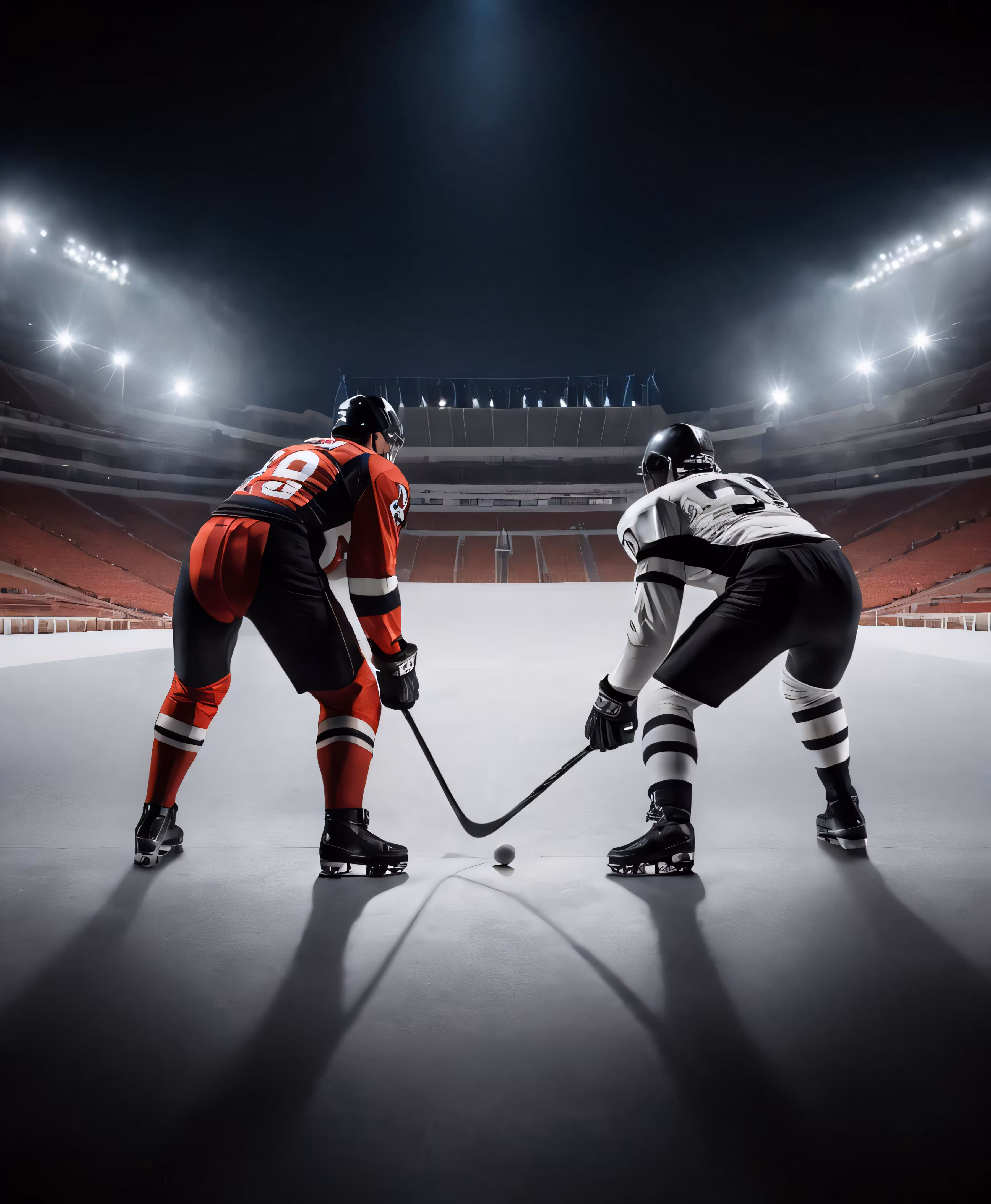 High resolution picture, free to use, an advertisement for a bicycle shop and it says 30 /two ice hockey players in red and black uniforms playing on an outdoor arena with stadium lights overhead