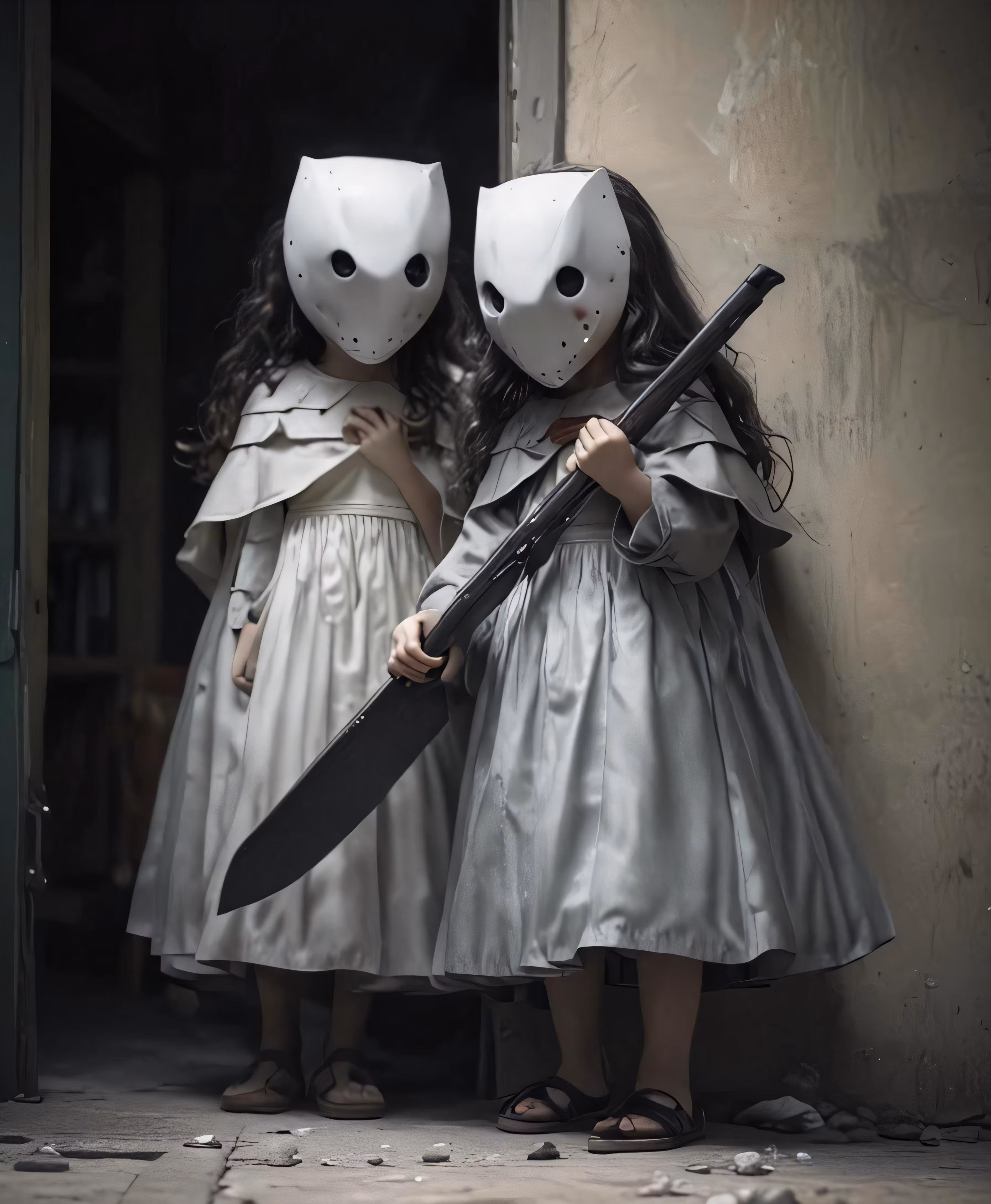 High resolution picture, free to use, an advertisement for a bicycle shop and it says 30 /two little girls wearing white costumes standing next to each other with their hands on the guns