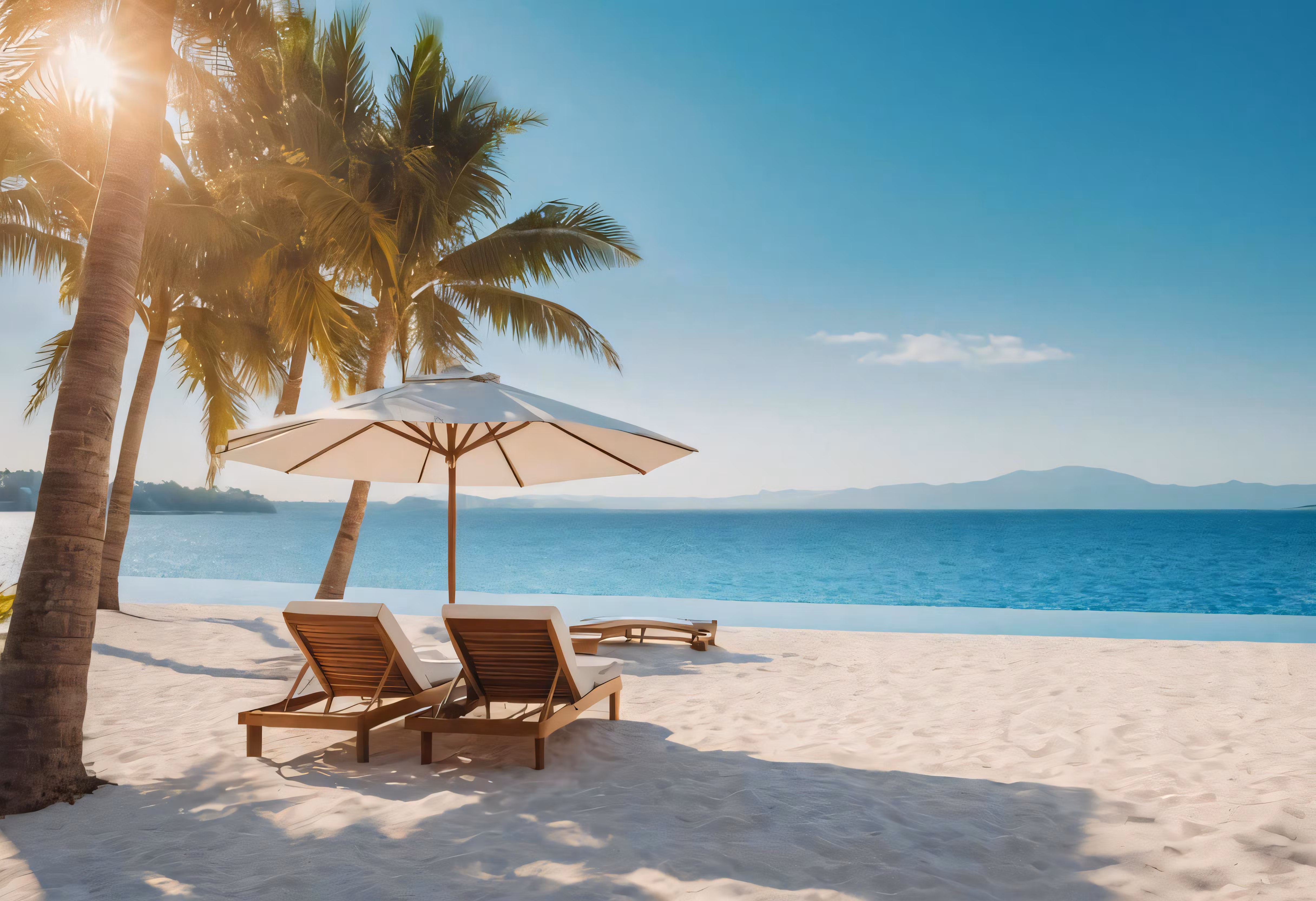 High resolution picture, free to use, an advertisement for a bicycle shop and it says 30 /two lounge chairs under an umbrella on a beach